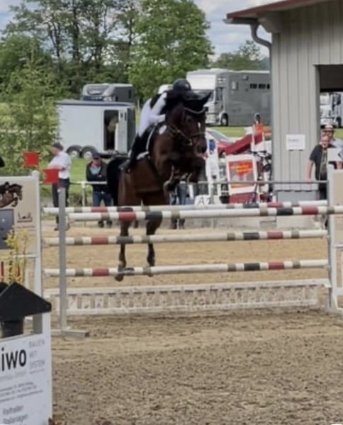 **Diofeh** Unter dem Sattel zeigt sie ein angenehmes Go und gute Gangarten. Aktuell wird sie von meinen Töchtern (14 und 16 Jahre) geritten. Sie ist auch schon mit ihnen problemlos bis 1,25 m gesprungen, was ihre Rittigkeit und Zuverlässigkeit zeigt. Perfektes Pferd um in den Turnier Sport zu starten und sich hochzuarbeiten! Sie ist verladefromm, brav beim Hufschmied und sowohl alleine als auch in der Gruppe geländesicher. Auch Wasser und die Arbeit an der Doppellonge kennt sie. Dio versteht sich mit Wallachen und Stuten gleichermaßen! Sie war letztes Jahr einmal ungeklärt lahm- darf aber seit Monaten normal geritten und auch gesprungen werden!