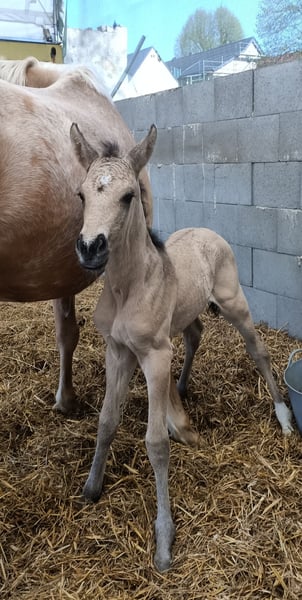 This powerful mare not only impresses with her calm and people-oriented character but also with her genetics. She carries two dilution genes, namely the cream gene and the dun gene, making her a true buckskin with a dorsal stripe on her back and zebra stripes on her legs (known as Dunskin, which combines buckskin and palomino). Additionally, she boasts a flawless and extremely correct conformation, standing on strong, healthy legs. She owes this to her parents, as her father is none other than the Lusitano stallion Inefavel, who competes at Grand Prix level. He has recently been recognized by the Oldenburg Verband and captivates not only with his unique appearance but also brings the necessary toughness and robustness that have become less prominent in modern sport horse breeding, all while maintaining excellent movement potential. His offspring are known for their quality and charisma, so it is no surprise that this little ballerina received an above-average rating from the association and can be called a premium foal. On the maternal side, a clear-headed versatile Czech line meets the highly sought-after blood of the influential stallion Quarterback. The resulting dam of this little mover teaches her foal how relaxed interactions with the environment and people can be, making the learning period for the basics a breeze. She is familiar with everything one needs to know, meaning leading, grooming, tying, and picking up hooves are no problem. Since we only raise two large foals a year, she has also experienced plenty of family connection in her young life. Her birth and upbringing have been absolutely complication-free, and she has had the opportunity to grow up with plenty of movement on various surfaces. Specifically, she spent the first three days with her mother in a 4x6m outdoor box and then enjoyed 24-hour access to the paddock with another mare and her foal. This also means that, despite having shelter, she has experienced all kinds of weather. Trade or part-exchange for a pregnant broodmare (black or special color) is possible.