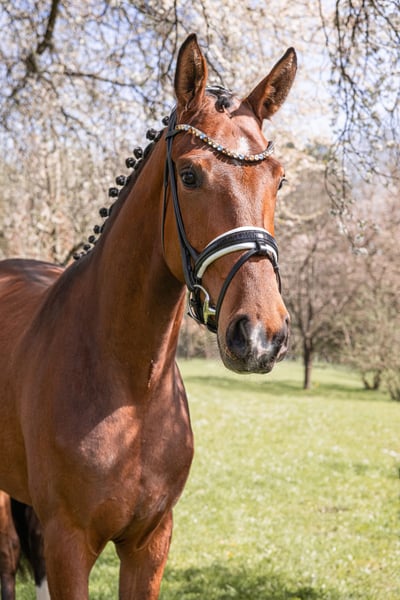 This strikingly elastic 3-year-old mare is seeking an ideal home to continue her breeding career! Her dam was multiple winner at Grand Prix level. The mare has been lunged, is familiar with daily stable routines, and shows a strong willingness to learn. Current X-rays are available. Additional videos can be requested.