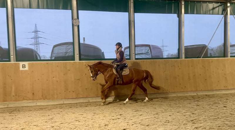 Zum Verkauf steht eine vielversprechende 5-jährige Stute von Sir Heinrich x Polytraum mit bestem Charakter und viel Herz. „Socke“ wurde Anfang 4 jährig schonend angeritten und ist jetzt ca. 1/2 Jahr konstant unter dem Sattel. Sie wird ca. drei bis vier Mal pro Woche mit viel Ruhe und Geduld weiter gefördert. Damit steht sie noch am Anfang ihrer Ausbildung und freut sich auf einen erfahrenen feinfühligen Reiter. Die Stute zeigt sich dabei stets lernwillig und neugierig. Im täglichen Umgang ist sie unkompliziert, lieb im Handling und dem Menschen positiv zugewandt. Sie kennt Stangenarbeit und springt bereits kleine Kreuze mit Freude. Eine tolle junge Partnerin für ambitionierte Reiter, die sich ein verlässliches, feines Nachwuchspferd wünschen, das Spaß an der Arbeit hat und noch viel Potenzial für die Zukunft bietet. Bei ernsthaftem Interesse oder für weitere Informationen stehe ich zur Verfügung. Kleine Befunde Alter: 5 Jahre Abstammung: Sir Heinrich x Polytraum Stockmaß: ca. 165 cm Einsatzbereich: Dressur / Springen / Freizeit / Allrounder