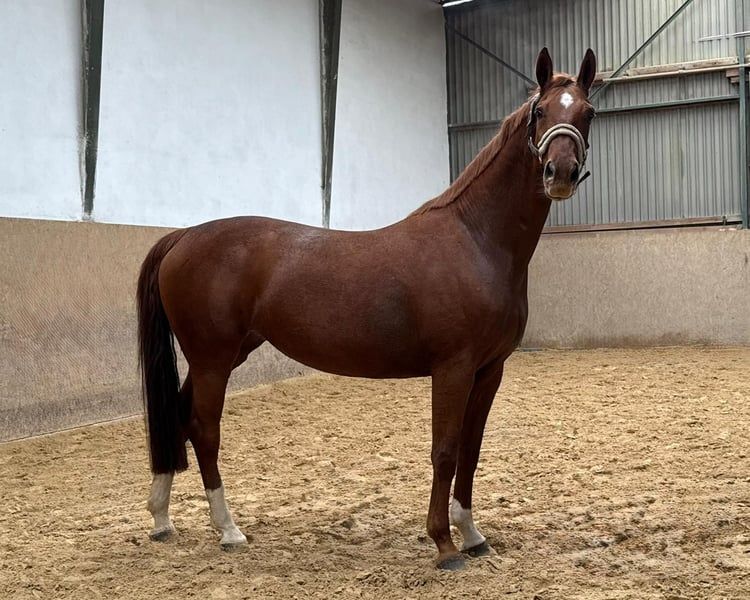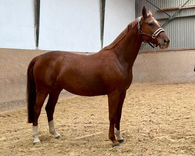 This 5-year-old chestnut mare impresses with her strong and expressive conformation. She comes from a good pedigree and has three very good basic gaits. When free jumping, she demonstrates attentiveness, good overview, and clean technique. Due to personnel changes in the past, she spent the summer on pasture. She is now back in work and will be started under saddle at the end of the year. Therefore, the sales offer is limited in time and depends on her current training progress. The mare is well-behaved in handling, eager to learn, and her correct, muscular build makes her suitable for larger riders. She is a promising all-rounder with quality for the ambitious leisure rider. X-ray images are not available at this time. ------- All our sale horses are regularly vaccinated and dewormed from birth. An annual routine dental treatment is also part of our standard care. For further details and questions about the horses for sale, please contact us by phone Monday to Friday from 9 a.m. to 6 p.m. Messages via eHorse are only answered selectively.