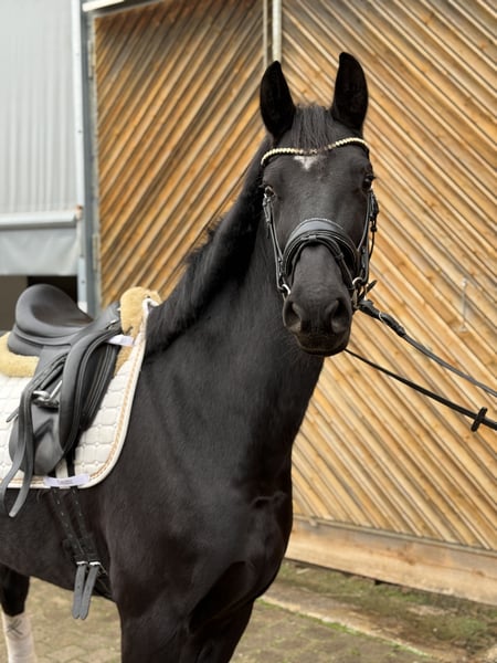 Schicke 6-jährige Rappstute Abstammung: Navarro x Belissimo Diese elegante Stute ist ein echter Hingucker und überzeugt mit ihrem freundlichen Charakter. Sie wurde bewusst spät angeritten und befindet sich aktuell schonend in der Ausbildung. Da sie noch etwas Grün ist, nicht für Anfänger geeignet. Derzeit misst sie ca 1.65m. Unter dem Sattel sowie im täglichen Umgang zeigt sie sich super brav, ausgeglichen und lernwillig. Durch ihre Abstammung bringt sie beste Voraussetzungen für den Dressursport mit und eignet sich ideal für Reiter, die Wert auf gute Grundqualität und ein unkompliziertes Pferd legen. Ein tolles Nachwuchspferd mit viel Potenzial für die Zukunft!