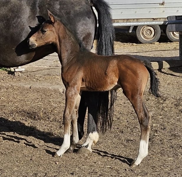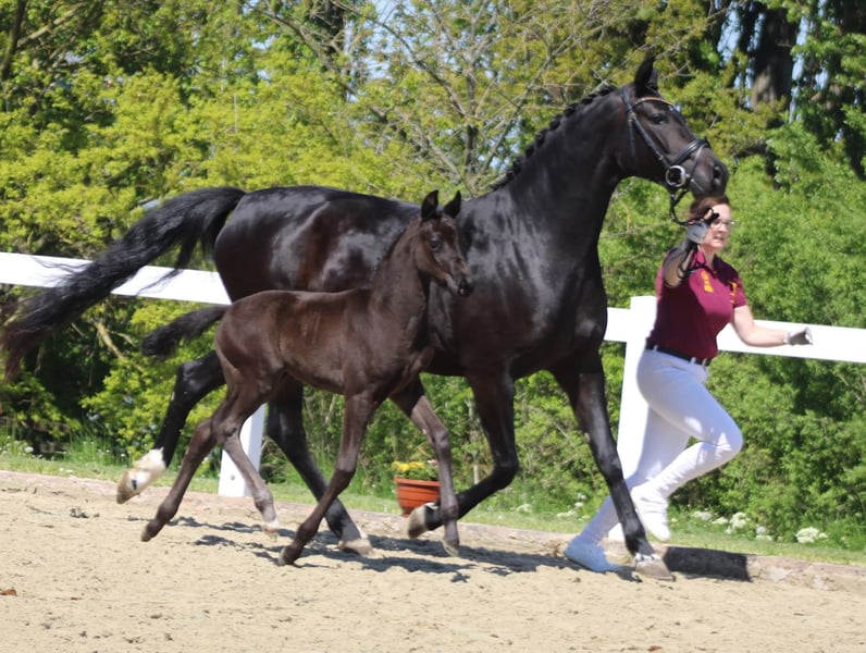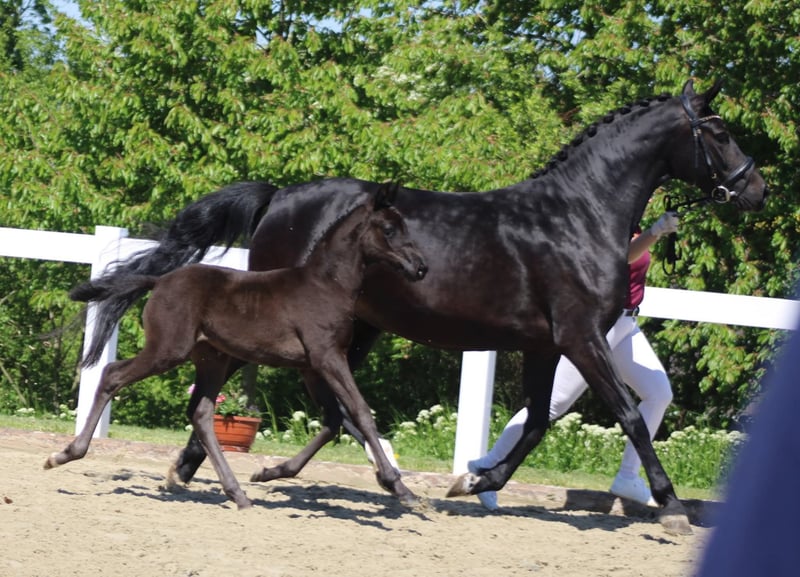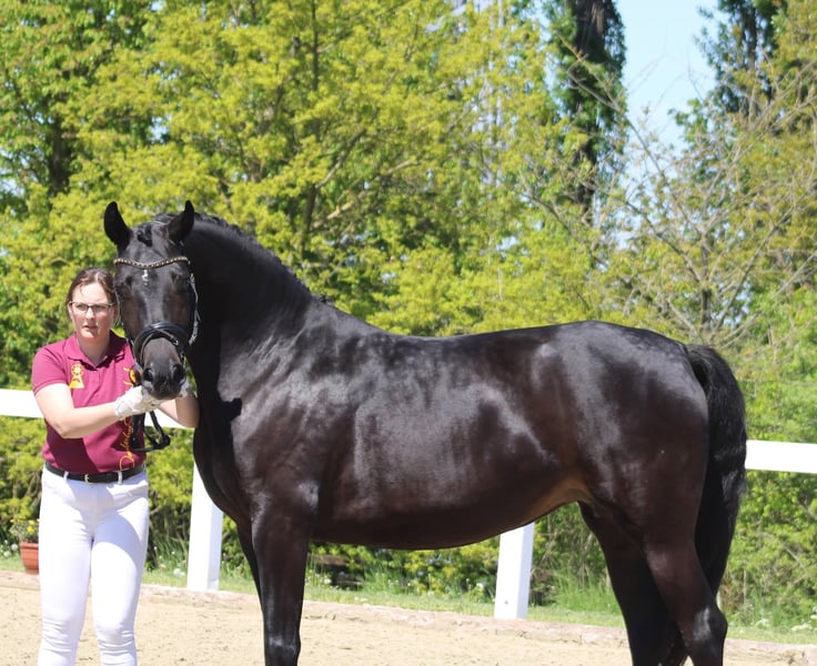 Wir verkaufen schweren Herzens wegen Zuchtumstellung eine äußerst typvolle und bewegungsstarke Staatsprämienstute mit SLP in LK I, Zucht bewährt, bereits ein überragendes Championatsfohlen vom Bon Courage in 2025 und aktuell ein Hengstfohlen von Kjento bei Fuß. Die Stute ist reinerbig dunkel und bringt somit keine Füchse. Aktuell ist sie besamt von Fenomenal für 2027. Die Stute kann sowohl mit als auch ohne Fohlen erworben werden. Ideal auch für Zuchtanfänger, absolut unkompliziert im Umgang, gibt ihren traumhaften Charakter an die Fohlen weiter. Es gibt kein Video und es wird auch keins angefertigt. Bei Interesse freuen wir uns über Kontaktaufnahme. Die Stute ist voll reitbar und war sehr rittig, müsste allerdings wieder an trainiert werden. Wir verkaufen sie jedoch bevorzugt an Züchter da sie in der Mutterrolle voll aufgeht