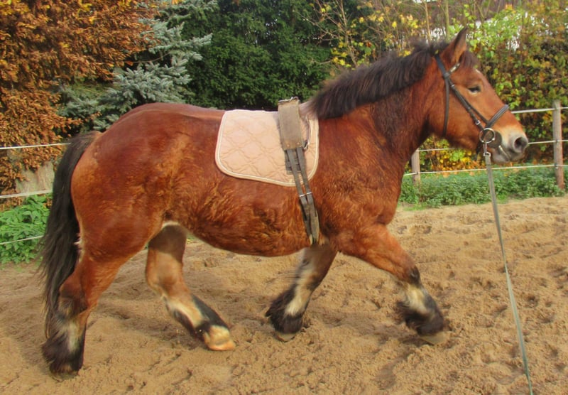 Ardenner Stute mit dem Herz am rechten Fleck, freundlich, gemütlich, verschmust, gut entwickelt, bereit bald ihre Ausbildung zu starten, volle Papiere, geht gut in den Anhänger und steht alleine ganz ruhig, kennt Abschwitzdecke, Gurt, Trense, spielerisch auch schon kurz an der Longe gewesen, alles macht ihr Spaß, kennt Hunde und Traktoren, steht lieb angebunden, zur Zeit 155 cm, deutlich überbaut, liegt ihr Endmaß um 160 cm
