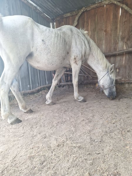 Noelle Race: ONC (Camargue x PSA) Color: Grey, dapple grey Characteristics: Pregnant Noelle is a 19-year-old ONC mare, approximately 1.55 m tall. She is pregnant and has a limited capacity (around 90 kg). She has spent her entire life in a riding club, and I have been working on building her confidence around humans, which still needs some improvement. She is not afraid in an arena or indoor riding school, but on a hack, she tends to be more alert and may react with some fear, though nothing aggressive. She has foaled seven times and is an excellent mother. She cannot live alone or in a box, as she panics in these situations. She can jump and has potential for club level 1 and dressage at club level 3, possibly higher with training. She is ridden by experienced riders, minimum level Galop 3. She has a strong, lively character. I am selling her because she unexpectedly became pregnant again, and I cannot afford to care for three horses. She is currently still very affectionate. Please contact me via message for more information and to arrange a test ride if possible. Phone: 07 85 63 47 02 Price: €950, negotiable within reasonable limits.