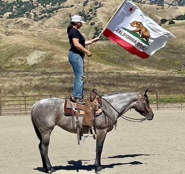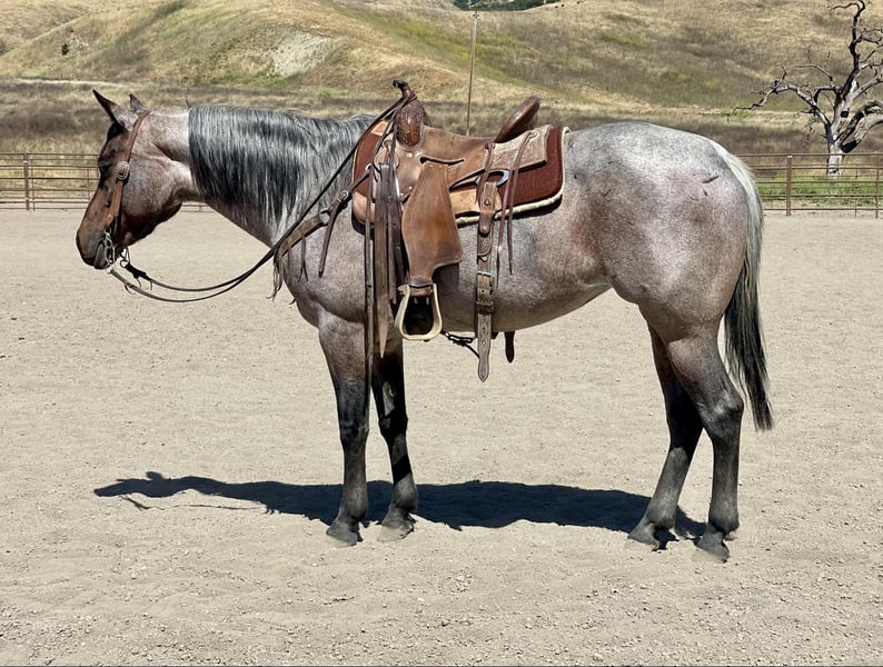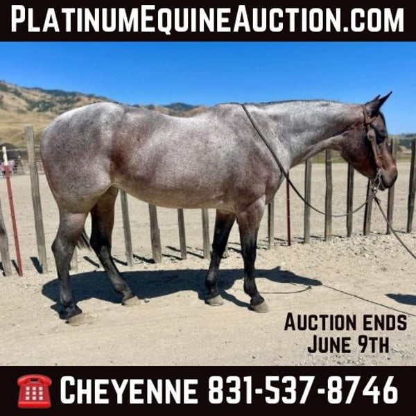 ONLINE AUCTION Place your bids at www.PlatinumEquineAuction.com Starting Bid $3500 Auction ends June 9th, 2024 Need a new saddle? Check out White Rock Saddles on our website or Facebook! Canela is a 8yr old fancy roan mare that stands exactly 14.2HH. This little doll face mare will steal your heart with her dog gentle demeanor, and fancy broke handle. Canela has an old soul and it shows. She can be trusted around kids of all ages and will take care of them on her back. She has zero spook and zero funny business. She is the safest, most honest horse you can find. She lopes pretty circles, very easy to control in the arena, one handed effortlessly neck rein. She does some fancy buttons when you ask for it. She knows how to spin each way, collect and have a nice collected stop. On the trail, she will go through or over anything you point her at without hesitation. She has been down many busy streets, as well as crowded mountain trails. She will go out alone or in a group and you can relax and have fun on her with her auto pilot mode. She has been around cattle, and other farm animals. She’s had ropes swung on her and doesn’t mind it at all. Nothing and I mean nothing phases her! Dogs, flags, tarps she will not blink an eye out. She is not a cranky mare, she has a very sweet and loving disposition. This is a user friendly mare that will suit any home. She has zero issues, she hauls great, easy to shoe, friendly in the pasture, and requires no maintenance. She will never get fresh with any amount of time off. She is as honest as you will find for a young aged horse! She is located in Bitterwater, CA. For more info contact Cheyenne Rey 831-537-8746. ONLINE AUCTION Place your bids at www.PlatinumEquineAuction.com Starting Bid $3500 Auction ends June 9th, 2024 Need a new saddle? Check out White Rock Saddles on our website or Facebook!