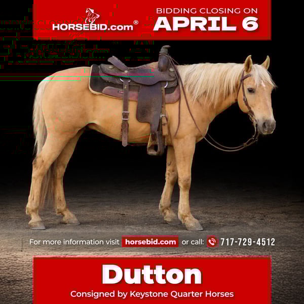 🌟𝑨𝒑𝒓𝒊𝒍 𝐀𝐋𝐋 𝐒𝐓𝐀𝐑 𝐋𝐈𝐍𝐄𝐔𝐏🌟 Happening now thru MONDAY | APRIL 6th - Available EXCLUSIVELY on HorseBid's website! For more details and to register visit: www.Horsebid.com CONSIGNOR CONTACT: Keystone Quarter Horses 717-729-4512 LOCATION: Mcconnellsburg, PA BREED: Quarter Horse REGISTERED: No REGISTERED NAME: Dutton *Family Safe* COLOR: Palomino HEIGHT: 14.2 AGE: 10 GENDER: Gelding Dutton is a 10-year-old palomino gelding standing a handy 14.2 hands tall, and he truly is the definition of a “unicorn” horse. With his golden coat and kind eye, he turns heads everywhere he goes—but it’s his gentle personality that really steals hearts. This sweet boy is as calm and well-minded as they come. Dutton is the kind of horse you can trust with your kids or enjoy yourself after a long day. He has absolutely no buck, bite, or kick—just a steady, willing attitude every time you swing a leg over. He’s patient, forgiving, and always aims to please, and he gives 110% in everything he does. Dutton has no spook and is a great horse to be around both in and out of the saddle. He’s been to town and has seen plenty of countryside, giving him the kind of experience that makes him a safe, reliable partner. He’s happy doing arena work, hitting the trails, or simply being your go-to confidence builder. Whether you’re looking for a dependable horse to babysit your kids this summer or a trustworthy mount to give lessons on, Dutton fits the bill perfectly. If you’ve been searching for that once-in-a-lifetime horse—the safe, gentle, and trustworthy kind that’s hard to find—Dutton is your guy. Horses like him don’t come around often. Please feel free to give Blake a call at 717-729-4512 for any questions !