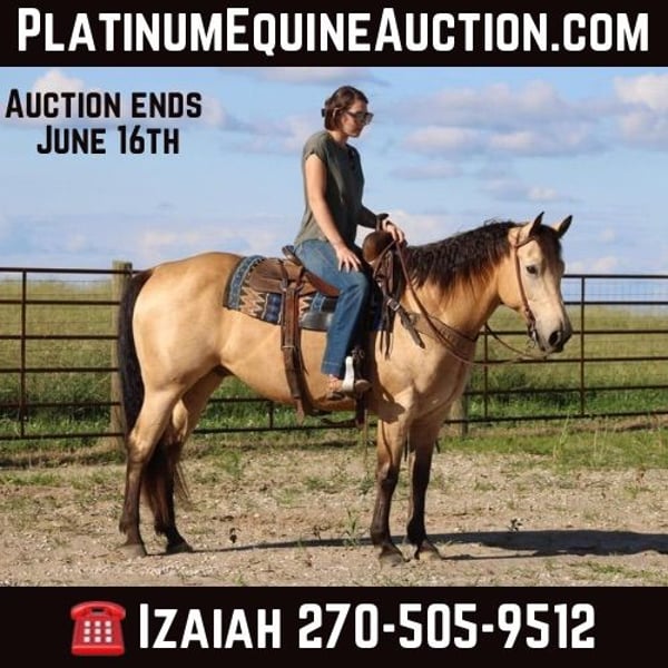 ONLINE AUCTION Place your bids at www.PlatinumEquineAuction.com Starting Bid $3500 Auction ends June 16th, 2024 Need a new saddle? Check out White Rock Saddles on our website or Facebook! APOLLO is an 8 year old quarter horse gelding! He is everyone’s favorite color and he has the conformation to go along with it! He stands a stout 14.3 to 15 hands and is put together like a tank! Here is a gelding that has been there and done that! He has been used on the ranch gathering cattle and loading trucks! He has also enjoyed the trails where he does well climbing hills, going through water, and just being a horse you can enjoy for a nice ride! Apollo rides like everyone loves! Very easy going! He has a super good stop and back up to him! He will also lope off from a stand still and has a super easy neck rein! Here is a gelding that most anyone that’s ridden a horse should get along with! He is good to catch and handle on the ground as well! If you’re looking for a handsome gelding with a good head on him here he is! He is such a good boy ! Buy with confidence! Call Izaiah Ryan 270-505-9512! Apollo is Located in Sonora Ky! ONLINE AUCTION Place your bids at www.PlatinumEquineAuction.com Starting Bid $3500 Auction ends June 16th, 2024 Need a new saddle? Check out White Rock Saddles on our website or Facebook!