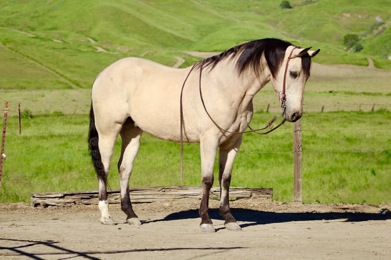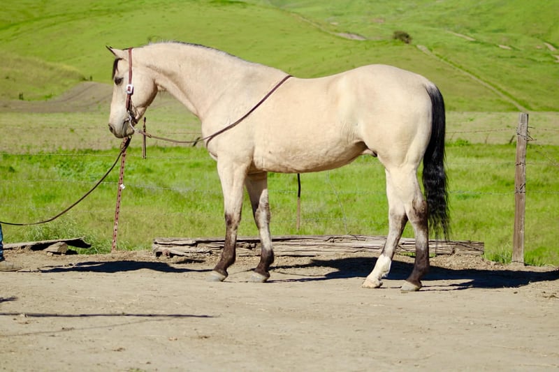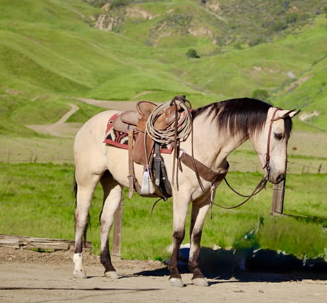"AVAILABLE ON ONLINE HORSE AUCTION AT www DOT PlatinumEquineAuction DOT com BIDDING OPEN NOW thru SUNDAY | MARCH 29TH! *Final price will be determined on auction site* CONSIGNOR CONTACT INFO: Longhorn Ranch 831-537-1915 LOCATION: Paicines, CA CASHEW 10 Year-Old Buckskin Gelding • 15 Hands If you’ve been searching for a true all-around gelding that is gentle, dependable, and capable of doing just about anything, Cashew is the kind people look a long time to find. With his handsome buckskin color, kind eye, and steady mind, Cashew is the type of gelding that makes every ride enjoyable and dependable every time you saddle him. Cashew absolutely loves people and is as friendly as they come. He meets you at the gate with a soft eye and an eager attitude, always ready to go to work or spend time with you. His personality is pure puppy dog — affectionate, willing, and happy to be your partner. Under saddle, Cashew rides soft, low-headed, and collected. He has a smooth jog, an easy lope, and fluid transitions that make him comfortable and enjoyable to ride. He spins nicely, and when you say “whoa” and sit in your seat, he plants his hind end and stops. Cashew is also a solid ranch and rope horse. He has been used to gather cattle, brand, and handle everyday ranch chores. He ropes both the head and heel side, giving the same steady, dependable shot every time, making him a great horse to enjoy and build confidence on in the roping pen. He has been hauled extensively and has seen plenty of country. From mountain and forest trails to riding through town around cars, trucks, and everyday commotion, Cashew stays calm, steady, and confident wherever you take him. On the trail he is dependable and sure-footed. Bridges, tarps, flags, balls, streamers, and obstacles are no problem for him, and he would step right into ranch trail classes with confidence. Cashew has also been trusted to safely introduce beginner and novice riders to riding. His patient nature and steady mind make him a wonderful confidence-building partner, staying calm, forgiving, and dependable while helping riders feel comfortable and secure in the saddle. On the ground he is respectful and well-mannered. He stands quietly to saddle, is great for the farrier, easy to clip, and will practically put his own head in the halter when it’s time to go ride. Cashew rides out confidently alone or with friends and is the same dependable partner every time you swing a leg over. He is comfortable whether kept in a stall or turned out in pasture and settles easily into new environments. He hauls excellent, travels quietly, and goes down the road without fuss — a true gentleman from the barn to the trail. Cashew is the kind of gelding that is hard to replace — the type you can rope on, trail ride, use around the ranch, or simply enjoy every day. Horses with this kind of mind, kindness, and versatility don’t come along often. Paicines, California Call or Text Dina – Longhorn Ranch – 831-537-1915 Nationwide shipping available. We are happy to help arrange transportation anywhere in the U.S.