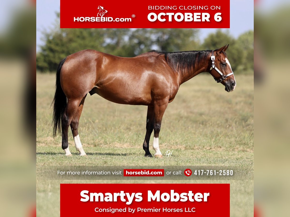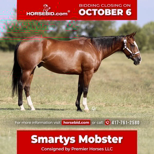 🍂 𝓐𝓾𝓽𝓾𝓶𝓷 𝑨𝑳𝑳 𝑺𝑻𝑨𝑹 𝑳𝑰𝑵𝑬𝑼𝑷 🍂 Happening now thru MONDAY | OCTOBER 6th - Available EXCLUSIVELY on HorseBid's website! For more details and to register visit: www.Horsebid.com CONSIGNOR CONTACT: Premier Horses LLC 417-761-2580 LOCATION: Buffalo, Missouri BREED: Quarter Horse REGISTERED: Yes REGISTERED NAME: Smartys Mobster COLOR: Bay HEIGHT: 15 AGE: 9 GENDER: Gelding You cannot go wrong with this gelding, he packs a sought after pedigree and is seasoned pro on the trails and ranch! Smarty is a gorgeous bay color with striking chrome to surely standout wherever you take him. Notably he is an by the NRHA $1 million dollar sire, HF Mobster, and out of cool old school cowbred mare. The total package! Smarty has been down the toughest of trails and knows how to take care of his rider. He goes down steep embankments with ease and briskly goes back up them. Smarty goes through mud or slick ground with ease. He goes over all the obstacles including bridges, opening the mailbox, and traffic safe. He is so good with traffic he has been ridden through Fort Worth Stockyards! Smarty rides as one should with a user friendly neck rein, good stop and back. He trots and lopes smooth circles and with a draped rein. He has roped calves, sorted and gathered cattle as well. Smarty has been some time doing the ranch classes, always excelling in them. Don’t miss out on this dependable and solid gelding!