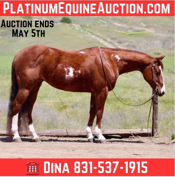 ONLINE AUCTION Place your bids at www.PlatinumEquineAuction.com Starting Bid $3500 Auction ends May 4th, 2025 Need a new saddle? Check out White Rock Saddles on our website or Facebook! The most charming and laid-back paint gelding you’ll ever come across! This 15-hand, 9-year-old sweetheart is like the ultimate gentleman of the horse world. Seriously, he’s always calm and safe, no matter what you throw at him. Perfect for kids, he’s cautious and makes sure his little riders feel secure. Whether you’re a total newbie or a seasoned pro, 7up adapts to your level like a champ. He trots and lopes with smooth stops and effortless transitions into his backup and a nice turnaround to show him off to your friends. But wait, there’s more! On the trails, he’s a superstar. This guy navigates tricky paths, dense brush, and even water with the poise of a seasoned explorer. He’s cool riding solo or with a group, and he won’t bat an eye if you ask him to venture off from the herd. Obstacles? Bring ’em on! Bridges, tires, covered wagons, pool noodles—7up handles it all like a champ. Plus, he’s got some ranch skills under his belt—gathering pairs, loading trucks, and branding. You can trust him with novice riders; he’s like a babysitter on four legs! And let’s talk about his ground manners—he’s a total gem. Loves being tied up, enjoys a good pampering session, and stands like a soldier for his baths. He’s friendly, adores treats, and gets along great with his pasture pals. Loading him up is a breeze, and he stays the same cool dude no matter where you take him. He’s up to date on all his shots and hoof care, so you can focus on making memories together. If you’re ready to find your dream horse, give Dina at Longhorn Ranch a shout at 831-537-1915. Trust me, you’re gonna fall head over heels for 7up! Located in Paicines, CA. ONLINE AUCTION Place your bids at www.PlatinumEquineAuction.com Starting Bid $3500 Auction ends May 4th, 2025 Need a new saddle? Check out White Rock Saddles on our website or Facebook!