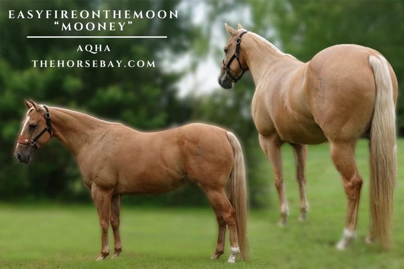 Lernen Sie „EasyFireOntheMoon“ (Mooney) kennen, einen auffälligen AQHA Palomino Wallach von 2016. Stammbaum: Der Großvater ist Fire Water Flit, ein legendärer Hengst, der dafür bekannt ist, Nachkommen hervorzubringen, die über 5 Millionen Dollar im Barrel Racing und Rodeo-Events verdient haben, darunter mehrere NFR (National Finals Rodeo) Qualifikanten sowie AQHA und WPRA (Women’s Professional Rodeo Association) Weltmeister. Er hat auch bedeutende Verdienste als Züchter von Futurity- und Derby-Champions in den letzten drei Jahrzehnten. Ein bewährter Produzent, der mehr Champions in jeder Disziplin gezeugt hat als jeder andere Hengst. Vielseitigkeit mit Genetik, die nicht nur im Barrel Racing, sondern auch im Roping und anderen Rodeo-Events erfolgreich war. Sein Einfluss ist seit über 30 Jahren zu spüren. Mit einer soliden Größe von 15 Händen ist Mooney so sanft und freundlich, wie man es sich nur wünschen kann, mit mehr „Whoa“ als „Go“. Er wurde professionell in vielen verschiedenen Disziplinen ausgebildet, darunter Roping, Barrel Racing, Stangen, Rinder sortieren und Mounted Shooting. Mooney wurde im Wald geritten, beim Treiben von Rindern eingesetzt und hat Fohlen begleitet. Mooney ist ein schöner Bewegungsreiter, ein vielseitiges, geschmeidiges Reitpferd, das nicht zuerst longiert werden muss; einfach aufsteigen und losreiten. Mit seiner Ausbildung könnte er ein großartiges Ranch Riding Pferd werden. Er ist gesund, gut ausgebildet und hat keine Laster. Wenn Sie nach einem hübschen und talentierten Pferd suchen, ist Mooney bereit, Ihr nächster Partner in der Arena oder auf der Ranch zu werden.