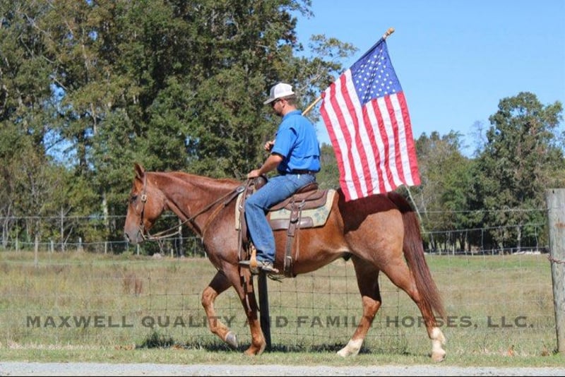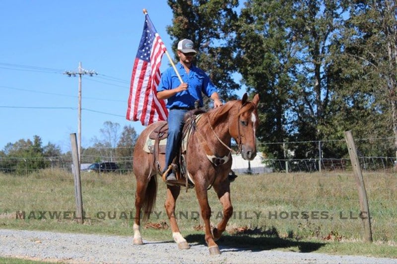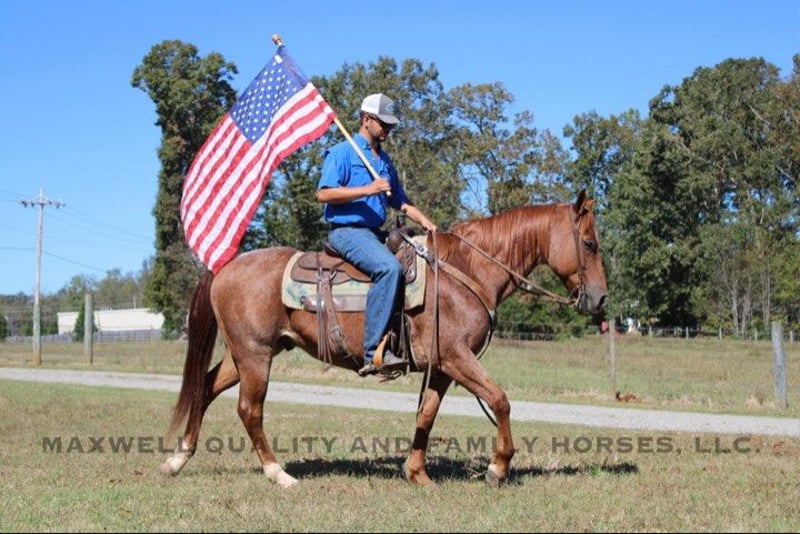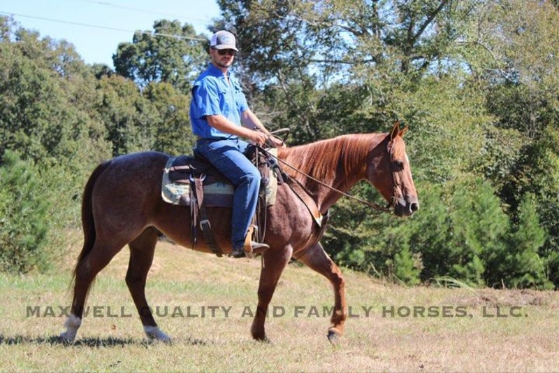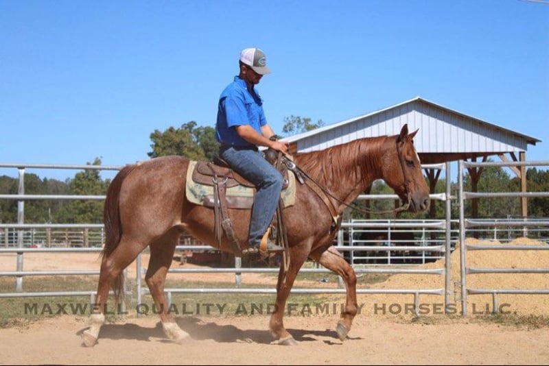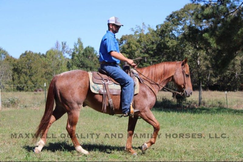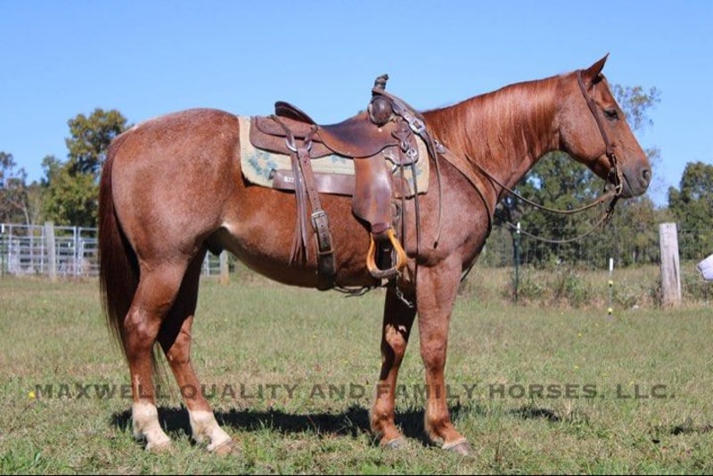 ONLINE AUCTION Place your bids at www.PlatinumEquineAuction.com Starting Bid $3500 Auction ends November 17th, 2024 Need a new saddle? Check out White Rock Saddles on our website or Facebook! Clyde is a 8 year old, grade quarter horse, Red Roan gelding that stands 15h. Clyde is as gentle as a puppy dog and will follow you around the pasture. A good all around horse, he will cross it all with a level head and easy going attitude. Clyde will walk, trot, canter in the pen or outside and would make a great prospect for any skill set. He has been used on ranches and joy rides and settles in any environment. Clyde rides one handed, side passes, loads, and stands well for the farrier like one should. Here is a gentle, good minded gelding anyone can enjoy. 100% Sound and sane! Located in Cherryville NC can set up delivery anywhere in the US if needed. Call Maxwell Family Horses Landon 704-689-9035 or Text for more info. ONLINE AUCTION Place your bids at www.PlatinumEquineAuction.com Starting Bid $3500 Auction ends November 17th, 2024 Need a new saddle? Check out White Rock Saddles on our website or Facebook!