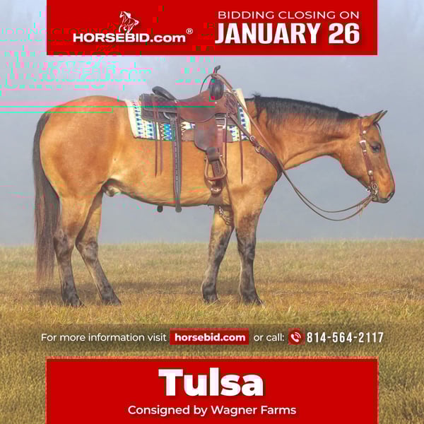 𝐉𝐀𝐍𝐔𝐀𝐑𝐘 ⭐️𝑨𝒍𝒍 𝑺𝒕𝒂𝒓 𝑳𝒊𝒏𝒆𝒖𝒑⭐️ Happening now thru MONDAY | JANUARY 26th - Available EXCLUSIVELY on HorseBid's website! For more details and to register visit: www.Horsebid.com CONSIGNOR CONTACT: Wagner Farms 814-564-2117 LOCATION: Clarion, PA BREED: Quarter Horse REGISTERED: No REGISTERED NAME: Tulsa COLOR: Buckskin Dun HEIGHT: 15.1 AGE: 10 GENDER: Gelding Tulsa is a 10 Year Old Buckskin Dun Quarter Horse Gelding. Standing 15.1 hands tall and has a nice stocky built to him. He is a beautiful Dun color with all the dun factors. Has the dorsal strip and stripes on his legs. Tulsa is a steady eddy! He will be the same horse each and every time you ride him. Dependable and Reliable. Tulsa has a nice one hand neck rein, good stop and back up. He has a nice smooth trot and canter and lopes nice circles each way. Tulsa is a great trail horse and has been trail ridden many of miles. Very seasoned and a been there done that trail horse. Goes where ever you point him on the trail and doesnt refuse water or mud and will step over the logs with ease. Tulsa also rides very nicely in the arena . Tulsa has worked on a large ranch and carries there ranch brand on his shoulder. He can perform and do any job on the ranch such as rope and drag calves to the branding fire, doctor cattle and check fences. Super Quiet and Gentle to ride and would make a good family horse in my opinion. Tulsa just had a wellness vet exam on 1-12-26 and passed everything. Whoever buys Tulsa will absolutely love him. Call or Text Glory at 814-564-2117. We can help arrange delivery anywhere in the United States. Thank You and God Bless