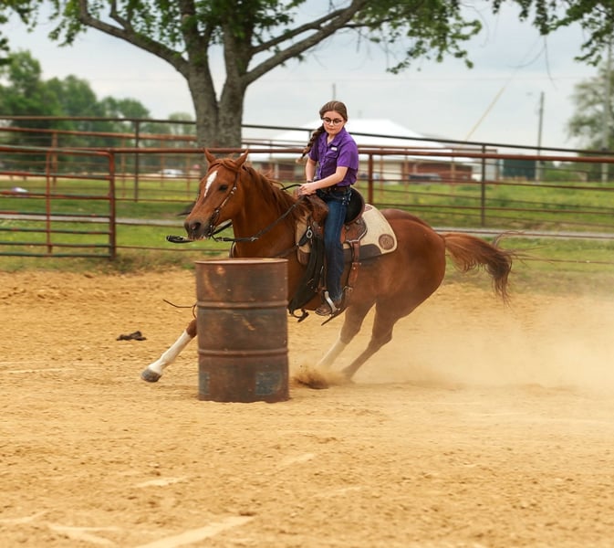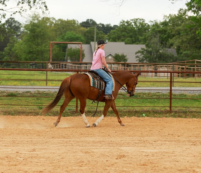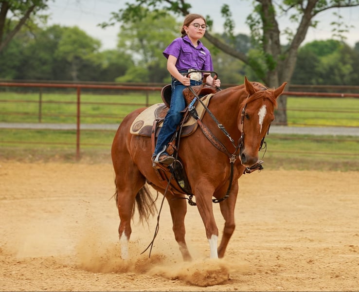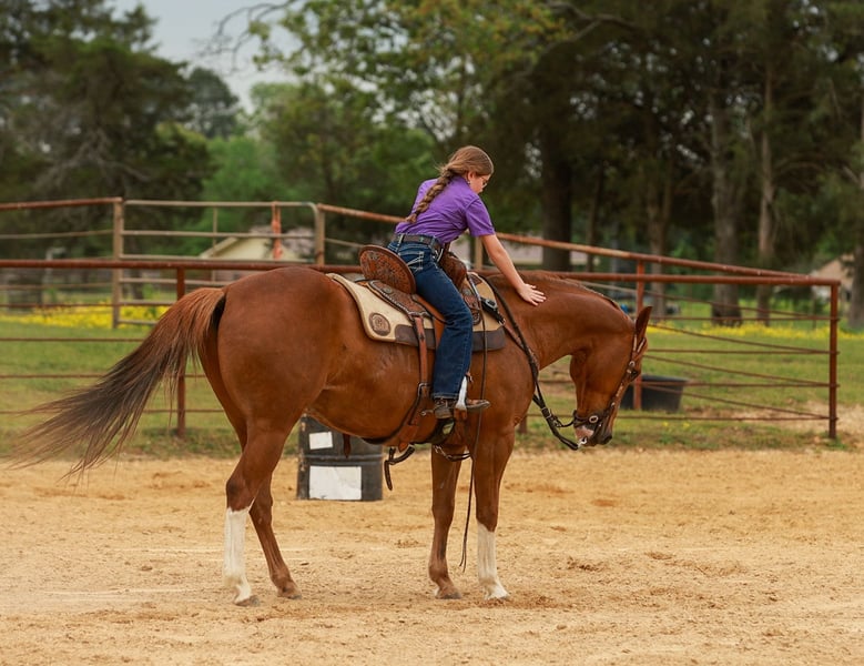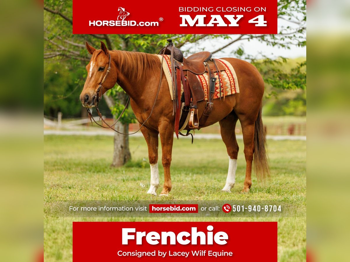 Frenchie, un gelding AQHA de 10 años, de 14,1 manos, de color alazán.