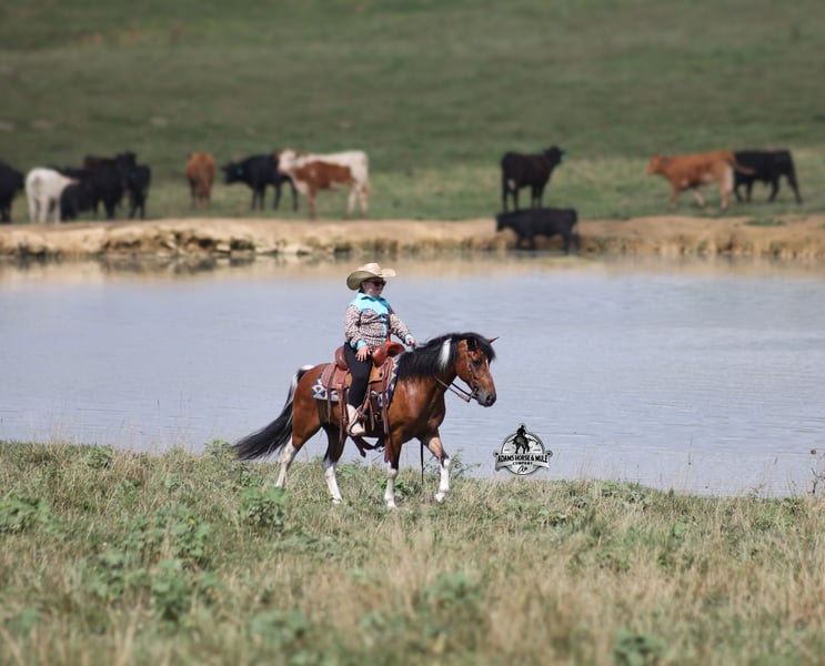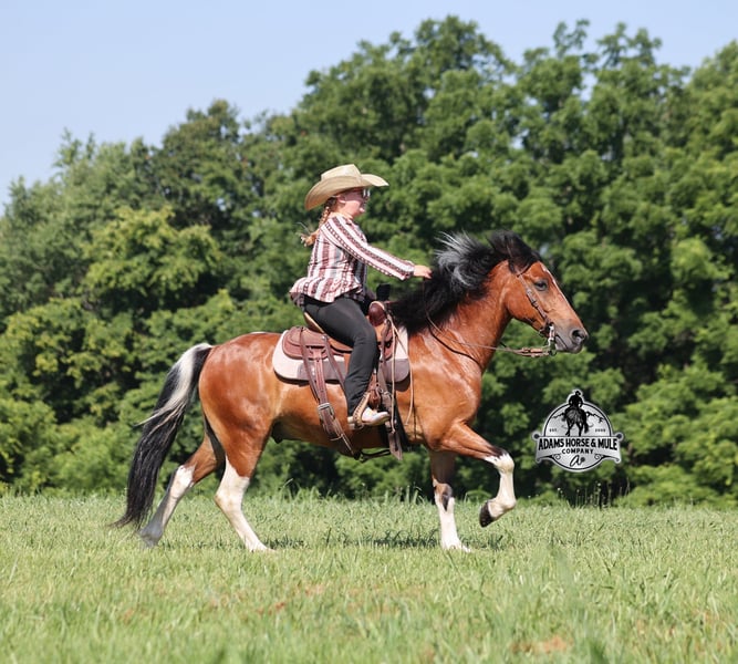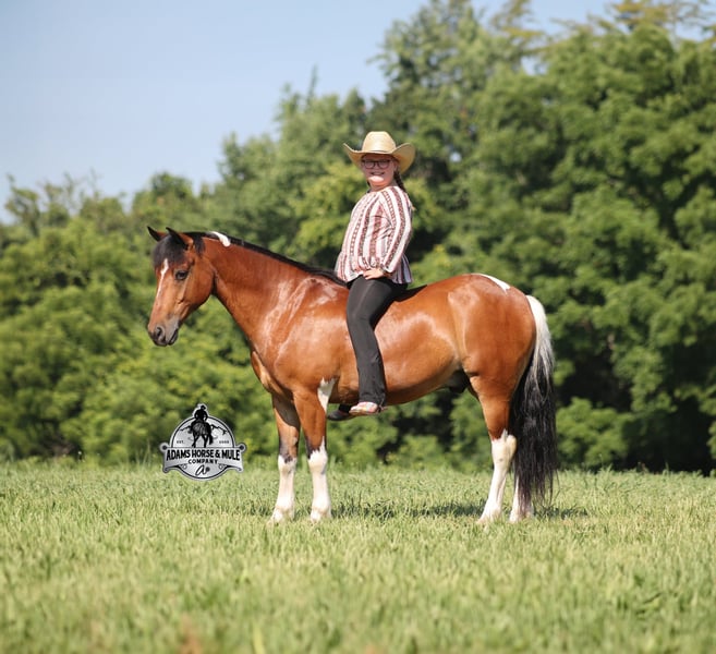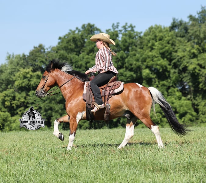Snickers is consigned to the Best Of The West Horse Sale in Gladstone, NJ on September 26-27th. You can bid online or bid in person. There is a preview day before the sale or you can come ride him prior to the sale in Mt. Vernon, KY. Snickers is a 12.2h, stout built, 9 year old, paint quarter pony and he is sure you be your favorite little boy’s or little girl’s dream come to life! Snickers has been our little girl’s(Lynnlee) whole world for the last two years and now it’s time to move him along to another family and let him do his job of teaching some other kids how to ride while sitting them on the path of many years of success in the saddle. At 9 years old and 12.2hh he is the perfect age to have the experience and the perfect size to carry any size kid. Snickers is responsible for millions of smiles, thousands of giggles, and countless miles and hours of fun with our little girl… all while doing it flawlessly, completely safe and as close to perfection as a horse can get. Even early on before Snickers gave Lynnlee the confidence that she has now, Snickers would tolerate her mistakes with the reins, he would never take advantage of her and was very patient. Confidence comes easy with Snickers as he is one hand broke, he neckreins around and goes anywhere that you point him, he walks quietly but moves out when asked. He has a smooth trot, he lopes nice circles, always takes the correct leads and just floats along slow and easy while on a complete loose rein. Snickers can go English or Western. He has been over the rails and does it with ease. Snickers has been ridden through town, is traffic safe, around cows and down the trails. He is a trail riding machine and will take the little riders safely anywhere that the adults can go… creeks, ditches, crosses logs, picks his way through deadfall or rocky paths… he is very sure footed and is not in a hurry! Snickers will ride out alone, leave the barn behind with no issues, will ride in the front of a group or way back behind everyone without a fuss. Snickers is the same horse whether ridden daily or if he is left in the pasture for a few months during the winter. Snickers is very friendly and loves to be groomed, whether that is standing patiently for an hour so Lynnlee can braid every hair that he has or getting soaked with a hose and scrubbed with a half of a bottle of shampoo… Snickers is the perfect kid’s horse, with his patients, confidence, rideability… do your little one a favor and make sure that Snickers next home is with them! For more info call 606-308-2461.