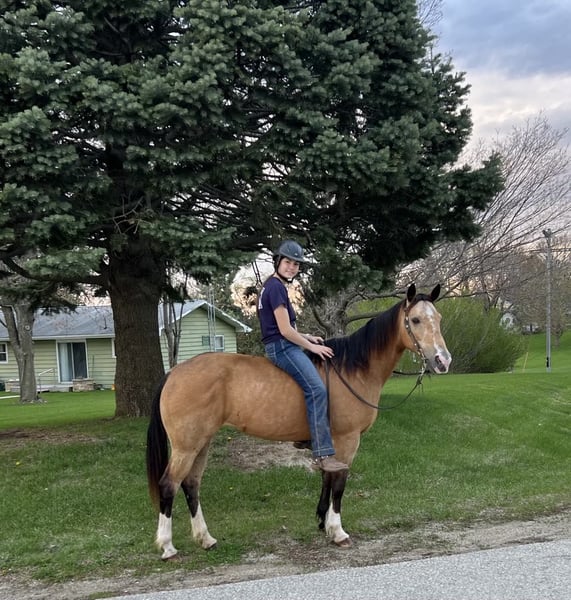 ONLINE AUCTION Place your bids at www.PlatinumEquineAuction.com Starting Bid $3500 Auction ends May 11th, 2025 Need a new saddle? Check out White Rock Saddles on our website or Facebook! Juliet is a stunning 14-hand buckskin mare with three high white socks, a black mane and tail, and eye-catching dapples. Her size makes her ideal for children or smaller adults. At 10 years old, she has plenty of experience under saddle and a calm, willing demeanor that makes her stand out. She’s been ridden extensively on trails, including trips through the Black Hills and Palo Duro Canyon, as well as across rivers and along highways. For the past two years, Juliet has been a steady and reliable horse in a lesson program, working with intermediate riders. She excels on the trail and in parades, showing excellent surefootedness and confidence in a variety of situations. Juliet has impeccable ground manners, stands quietly for the farrier, and is easy to mount from a block or even a picnic table. She is not spooky and has no history of bucking, biting, or kicking. Juliet is as easy to care for as she is to ride. She loads into any type of trailer, does well in both stalls and pasture, and requires no special feed or maintenance. She is comfortable barefoot or shod and can be ridden English, Western, or bareback. No matter the discipline or setting, Juliet is a willing, dependable partner. Located in Lisbon, IA. Contact John McPhail 319-721-7714 with any questions. ONLINE AUCTION Place your bids at www.PlatinumEquineAuction.com Starting Bid $3500 Auction ends May 11th, 2025 Need a new saddle? Check out White Rock Saddles on our website or Facebook!