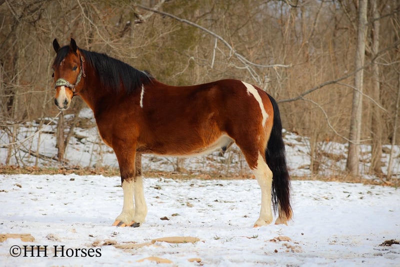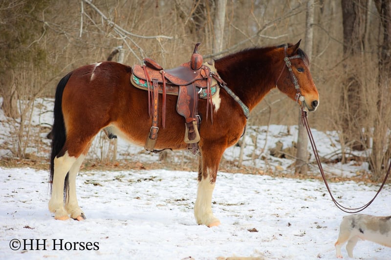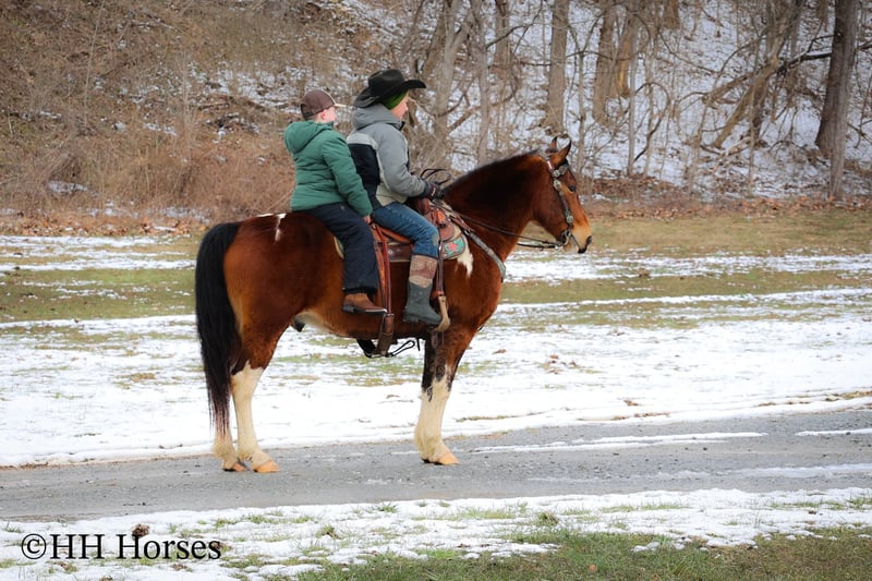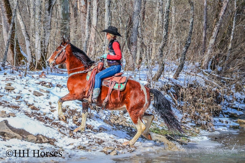 ONLINE AUCTION Place your bids at www.PlatinumEquineAuction.com Starting Bid $3500 Auction ends March 9th, 2025 Need a new saddle? Check out White Rock Saddles on our website or Facebook! This is “TOTANKA”, a super gentle, family friendly, and well trained BAY AND WHITE TOBIANO PAINT GELDING that is safe for the whole family. He has been ridden and shown by youth riders. He will lope nice circles, catch his leads, stop hard on whoa and back up. He willingly crosses streams and will travel over snowy and icy ground with confidence. This gelding will one step lope, one hand neck rein, and will not go any faster than asked of him. He rides double, triple, bareback, and in just a halter and lead rope. He loves attention, enjoys children, and is an easy keeper. He stands a stocky 14 hands tall and is 10 years old. He has excellent ground manners, can be handled by youth, and is also fine for novice and inexperienced adult riders. This gelding is stout enough to carry an adult rider and has good bone and feet. He is traffic safe, not spooky, and is a nice mover. He is the hard to find kind to come by. If you want a flashy family friendly paint gelding that the whole family can enjoy and love, don’t miss out. He has been around cattle and in the woods. If you’d like more info or want to make a Buy It Now Offer contact HH Horses Erin 304-238-4155 Located in Flemingsburg, KY. ONLINE AUCTION Place your bids at www.PlatinumEquineAuction.com Starting Bid $3500 Auction ends March 9th, 2025 Need a new saddle? Check out White Rock Saddles on our website or Facebook!