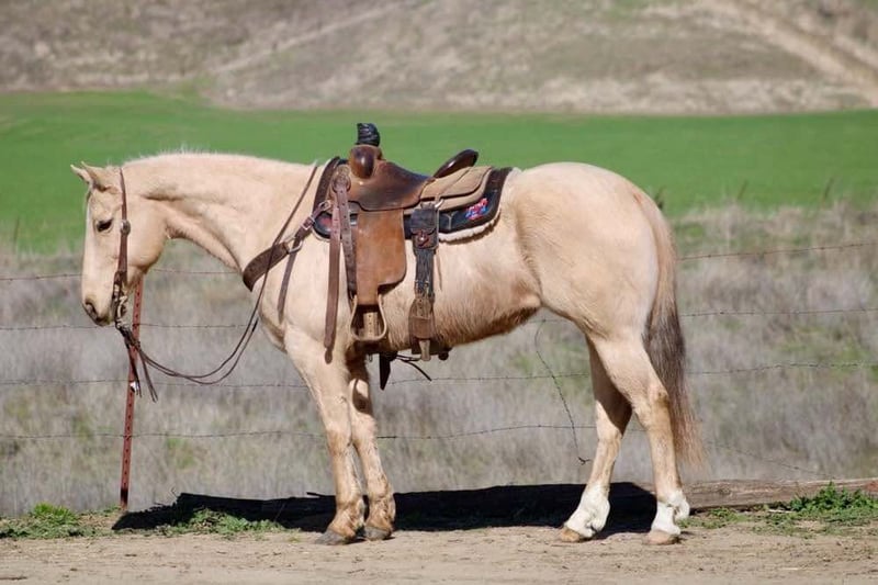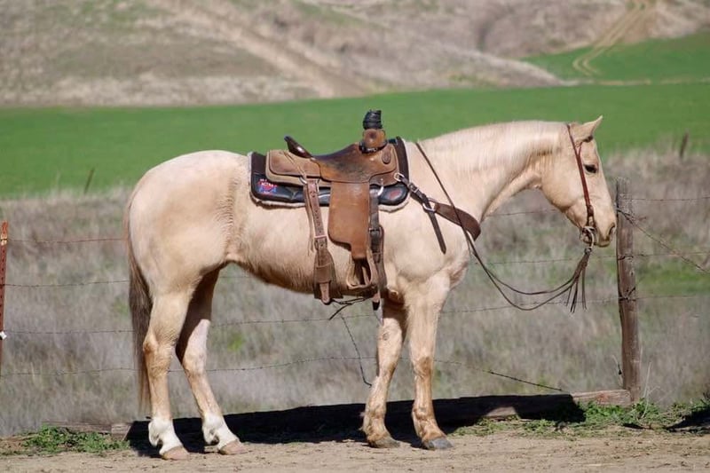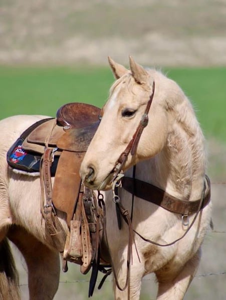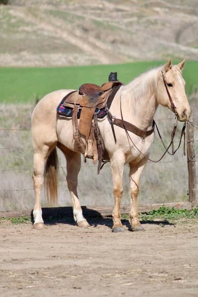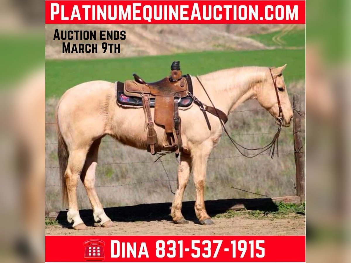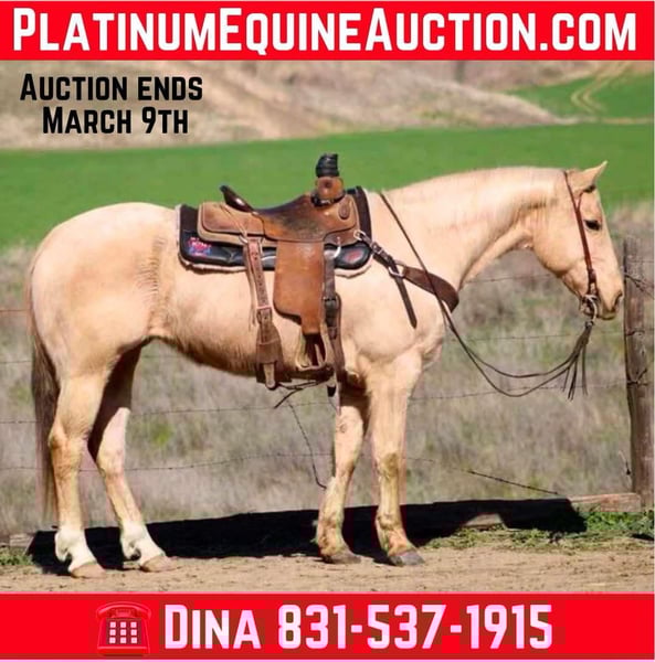 ONLINE AUCTION Place your bids at www.PlatinumEquineAuction.com Starting Bid $3500 Auction ends March 9th, 2025 Need a new saddle? Check out White Rock Saddles on our website or Facebook! Cinder is a true princess! She stands at 14.3HH and is the prime age of 10. After she sheds her winter coat, she will be the prettiest bright golden color you’ll ever see! This is a fancy, fancy broke mare with all the buttons you could want. Cinder is a true ranch horse, she has been rode outside tons, used to work gates, and gather cattle. She is familiar with everything on the farm. Tractors, animals, dogs, and more! Cinder has impeccable manners and is always on her best behavior. She is easy to catch and will stand for tacking up. She is good with her feet, and will always stands quietly tied. Cinder walk, trots, lopes pretty circles, has a super collected stop and easy reverse. She will spin like a Reiner and has all the cow horse maneuvers. She is very light in the bridle and is responsive to leg cues. This mare makes riding fun! She does not get fresh, and is safe for many levels. She has carried flags, been rode down busy highways, crowded trails, and easily goes over trail obstacles. Nothing phases her and she will go anywhere you point her. Cinder has been started heeling out of the box and shows great promise as a rope horse if you choose to pursue that career for her! This mare is a star in any direction you take her! Calm enough for the whole family and talented enough to be a perforce horse! She is the best of both worlds! She is located in Bitterwater, CA. Please contact Cheyenne Rey 831-537-8746 for any more info or make arrangements to come visit her! ONLINE AUCTION Place your bids at www.PlatinumEquineAuction.com Starting Bid $3500 Auction ends March 9th, 2025 Need a new saddle? Check out White Rock Saddles on our website or Facebook!