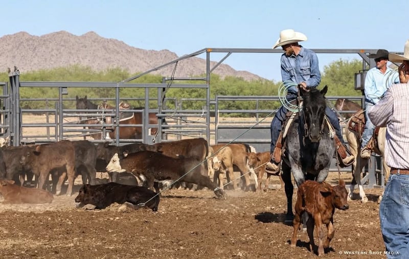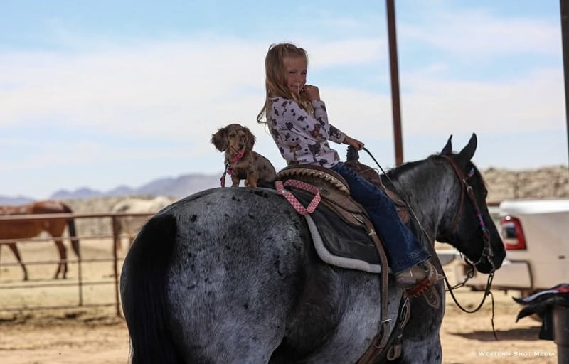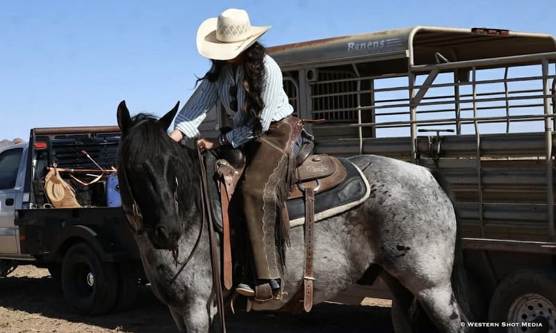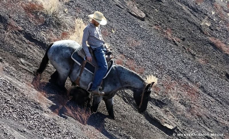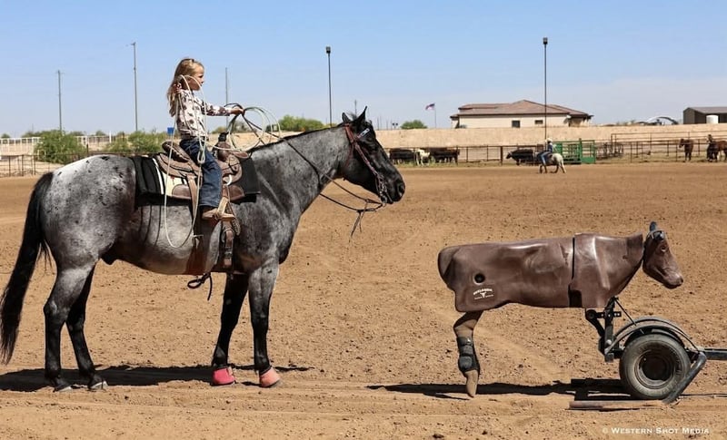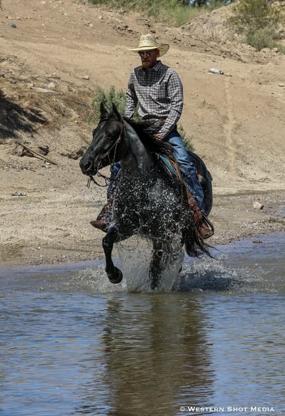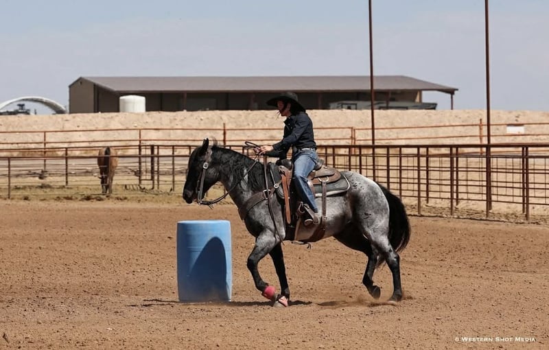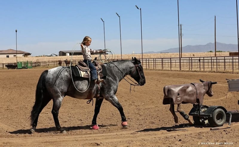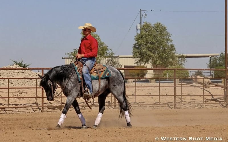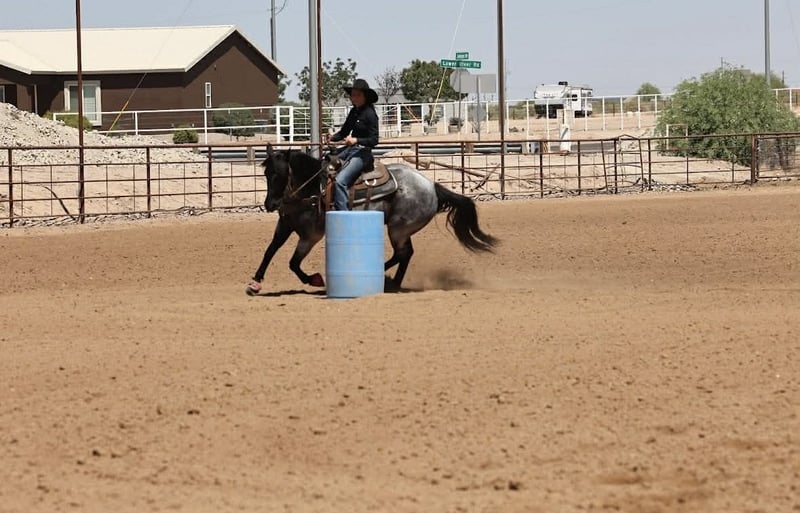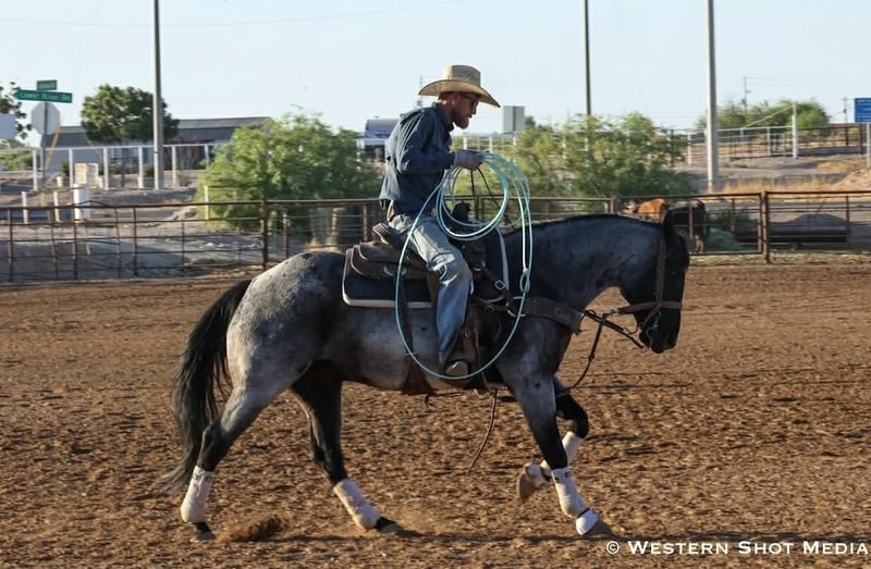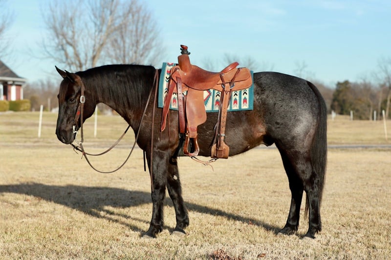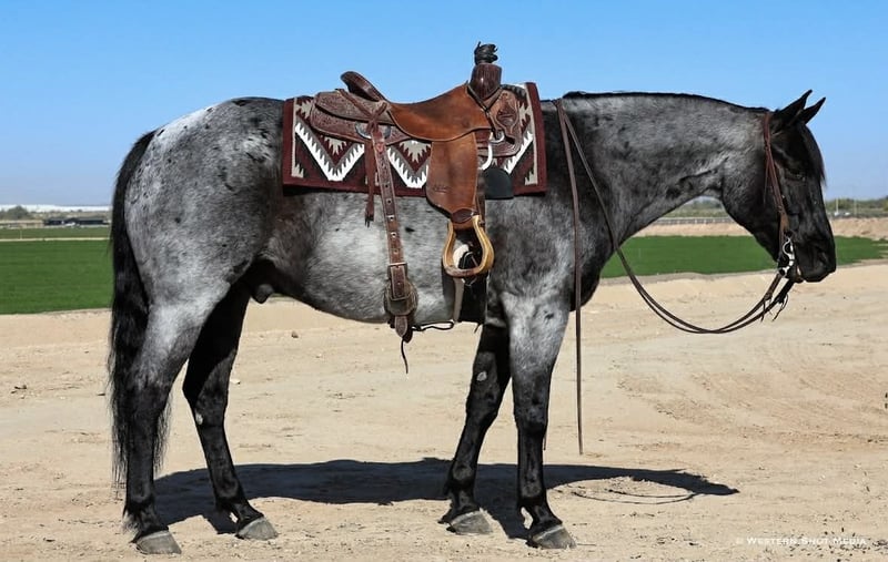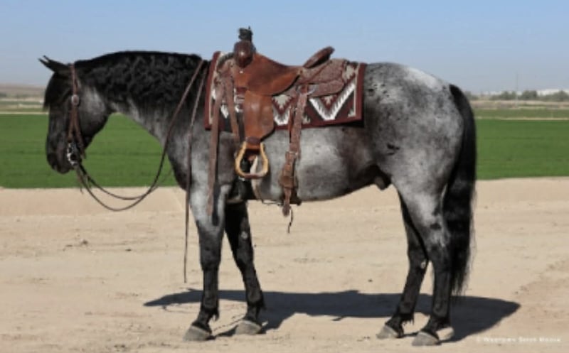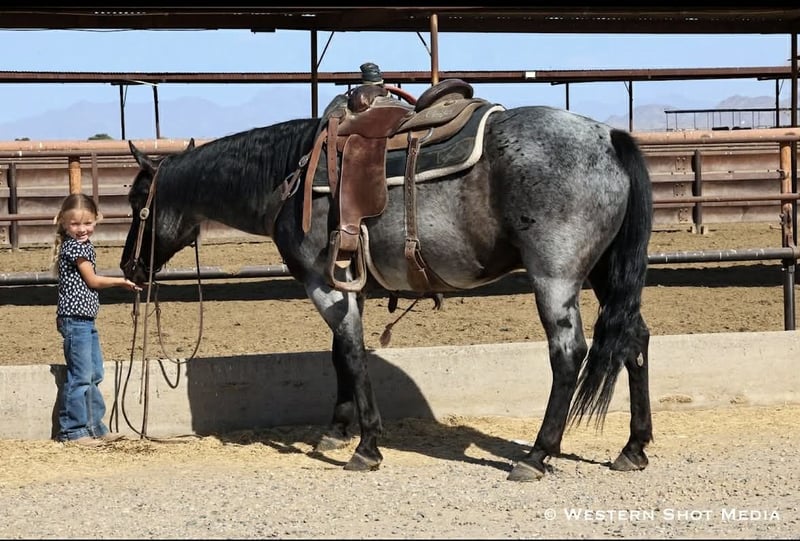 Dollar, un potro de 11 años, de 15 manos, en color roan azul, de la raza AQHA.