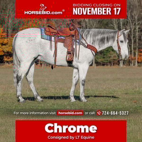 🎲𝓽𝓱𝓮 𝐑𝐈𝐃𝐄𝐑'𝐒 𝓒𝓱𝓸𝓲𝓬𝓮🎲 Happening now thru MONDAY | NOVEMBER 17th - Available EXCLUSIVELY on HorseBid's website! For more details and to register visit: www.Horsebid.com CONSIGNOR CONTACT: LT Equine 724-664-5327 LOCATION: Miola PA BREED: Grade (QH) REGISTERED: No REGISTERED NAME: Chrome COLOR: Grey HEIGHT: 15 AGE: 11 GENDER: Gelding Introducing Chrome! A stocky built grey QH (grade) Gelding. Chrome has been a working Ranch horse his whole life where he did all aspects of ranch work. He is very soft in the bridle and is soft to ques and commands. He neck reins, side passes and will collect up beautifully. Chrome really excels in arena work. He is a fun horse for play days and arena riding. He has a smooth jog and a fun quick turn around that makes working cows easy and smooth. Chrome has nice easy to sit jog and one step lope. He has also been used on trail rides. Though I wouldn’t recommend Chrome for a complete beginner because he has a lot of buttons and work ethic, he would love to be in a home with a job or a young kid wanting to try everything! Chrome is an absolute puppy on the ground. He has some of the best ground manners I have ever had on a horse. He stands tied quietly in cross tied or to the gate. He tacks up quietly and takes a bridle easy. He is great for the farrier and vet. Baths and grooms without moving a muscle. Chrome is has a great Vet Health Check and is ready to ride! For more information please contact me! Thank you and have a great day.