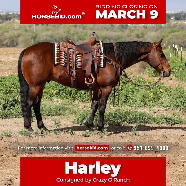 ℳ𝒶𝓇𝒸𝒽 ♦️𝐑𝐈𝐃𝐄𝐑'𝐒 𝐂𝐇𝐎𝐈𝐂𝐄♦️ Happening now thru MONDAY | MARCH 9th - Available EXCLUSIVELY on HorseBid's website! For more details and to register visit: www.Horsebid.com CONSIGNOR CONTACT: Crazy G Ranch 951-899-4900 LOCATION: Norco, CA BREED: Quarter horse REGISTERED: No REGISTERED NAME: Harley COLOR: Bay HEIGHT: 15.1 AGE: 11 GENDER: Gelding Harley is an 11-year-old Quarter Horse gelding with experience in all aspects of ranch riding. He is a finished rope horse that will head or heel, that knows his job and gives you the same solid run every time, quiet in the box and scores like a dream. Whether you’re hauling to jackpots, roping at home or putting in a full day’s work on the ranch, he’s steady, honest, and ready to go. Harley has been branded on, and gathered cattle. Harley has also completed obstacle courses and is a finished trail horse, making him confident and sure-footed outside the arena. Harley is good with tarps, barking dogs, street traffic. In the arena, Harley is fancy broke — soft in the face, moves off your leg, and carries himself beautifully. He has the kind of handle that makes him enjoyable for both work and pleasure riding, he is by far one one of the smoothest we have ridden! Harley can leave to sit and hop on and go! ✔ Finished head horse ✔ Ranch experienced ✔ Obstacle course experience ✔ Seasoned trail horse ✔ Fancy broke in the arena ✔ 11 years old, sound and healthy Harley is the kind of gelding that fits a variety of riders and programs. Whether you need a dependable rope horse, a ranch partner, or a classy arena ride, he’s ready to step in and go to work.
