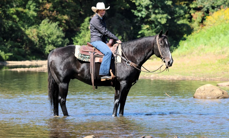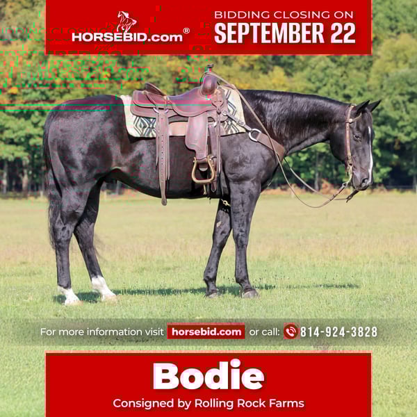 🍁𝒕𝒉𝒆 𝐅𝐀𝐋𝐋 𝑺𝒑𝒆𝒄𝒕𝒂𝒄𝒖𝒍𝒂𝒓🍁 Happening now thru MONDAY | SEPTEMBER 22nd - Available EXCLUSIVELY on HorseBid's website! For more details and to register visit: www.Horsebid.com CONSIGNOR CONTACT: Rolling Rock Farms 814-924-3828 LOCATION: Miola PA BREED: Quarter Horse REGISTERED: No COLOR: Black HEIGHT: 15.1 AGE: 10 GENDER: Gelding Bodie is the kind of horse everyone hopes to find: dependable, versatile and broke the right way. This 10 year old AQHA gelding stands 15.2 hands and is built to last, ready to be your partner for years of riding and fun. In the arena Bodie is a dream to ride. He is light and responsive with a true one hand neck rein. He trots collected with a headset and carries a smooth rocking chair lope you can sit all day. He is confident enough to ride bridleless, showing just how well trained and trustworthy he is. Bodie will open and shut gates, track and move cattle, and even will ride English just as nicely. Whether you want to lope pretty circles, pop over a crossrail, or simply enjoy a quiet evening ride, he is ready. Out on the trail Bodie is equally dependable. He is surefooted and confident across all kinds of terrain, creek crossings, wooded paths, open fields. Bodie will ride out alone or in a group without a fuss. Obstacles such as water, bridges, downed logs and wildlife never bother him. Making every trail ride relaxing and enjoyable. Bodie is as kind on the ground as he is under saddle. He is easy to catch in the pasture, lower in the pecking order, and loves attention. He stands quietly to be brushed, tacked, bathed, clipped and for the farrier. His quiet and forgiving nature makes him a perfect choice for a youth wanting to learn or for any rider who wants a truly safe, fun partner without sacrificing ability or personality. Bodie sells with a negative Coggins and up to date rabies vaccination. You simply cannot go wrong with Bodie. He is the steady, trustworthy partner that will bring years of enjoyment and confidence to his next rider. If you would like to check out Bodie or have any questions please feel free to contact Ethan at (814) 924-3828.