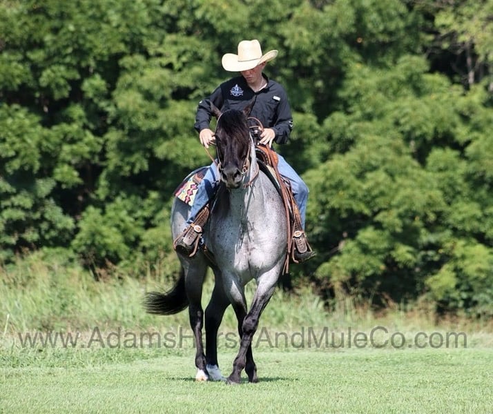 Go to www.AdamsHorseAndMuleCo.com for more pics and a video. AHAMC has been in the horse business and sold horses over the internet since 2005. We have a long track record of success with hundreds of happy customers. We work hard to match riders with the correct horses and specialize in beginner safe, family friendly horses that have been used and checked out by our family! Introducing Drifts Money Figure… He gets an “A” in every category but the best part of him is that he is all “B’s”… BIG, BEAUTIFUL, BRAINS and BLUE ROAN!!! Money is a stout built 15.1hh, 9 year old, True Blue Roan, Registered Quarter Horse Gelding! This fall and winter Money has been earning his living working on a feedlot. He has been loading trucks, sorting and doctoring cattle. He has been rode in big country with steep rough elevations. Money is a laid back gentle type of horse that still has all the buttons. Money content to mosey along down the trail and loves going on trail rides. He will cross creeks, ditches, logs and navigate rough rocky areas. He is safe riding in traffic. He has a smooth jog, a nice lope, a good stop, turns a circle both ways, sidepasses and backs with ease! Money has been exposed to all kinds of wildlife such as deer or turkey or other animals like cows or dogs and will go anywhere that he is asked too. He has been rode many miles in the mountains of Eastern Kentucky and encountered every obstacle possible on the trail. He will go up or down even the steepest slopes, across deep creeks, over downed trees, and over all types of rough terrain while still being sure footed. Money is a horse that can do any job that is asked of him, do it with ease and look good while doing it! Take a look at him and we believe that you will give him all A’s as well! Call Eric 606-308-2461 with any questions. Located in Mt. Vernon, KY.