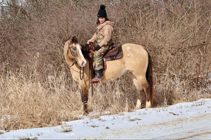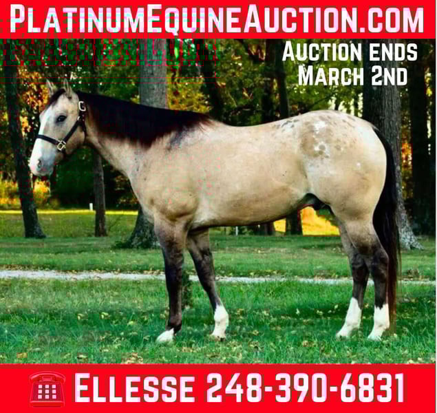 ONLINE AUCTION Place your bids at www.PlatinumEquineAuction.com Starting Bid $3500 Auction ends March 2nd, 2025 Need a new saddle? Check out White Rock Saddles on our website or Facebook! I’m excited to introduce you to “AA Done Up Right” or Spirit as we call him at home. He is a 9 coming 10 year old registered appaloosa gelding. He was imported from Canada as a baby and is registered with the appaloosa Horse Club of Canada. He stands a solid 15.3hh with nice conformation and a long thick mane and tail. Spirit is a stunning buckskin with a blanket of spots on his hindquarters, 4 white socks and a big blaze. He has the calmest demeanor of any horse you will meet. Spirit walk, trot and canters. He knows his leads and how to work off seat and leg. He shines out on the trails. He’s been ridden down the road, in deep woods, open fields, and in the mountains. There’s no hill to steep and no creek to deep. Spirit rides out alone all day long. He will go any direction you point him in and enjoys soaking in the views. He’s taught many beginner and nervous riders. You can let him stand for a month hop on and he rides off just the same. His manners are A+ and he loves people. Spirit stands tied for grooming, tacking, mounting and dismounting. He’s been trailered all over. He has also been picked. Spirit is a delightful horse who has a great laid back demeanor making him the perfect mount for anyone. He has also worked on a ranch sorting snd moving cattle! Please enjoy the video. Spirit lives in Howell, MI 48855 please call or text Ellesse Schwartz at 248-390-6831 for more information. ONLINE AUCTION Place your bids at www.PlatinumEquineAuction.com Starting Bid $3500 Auction ends March 2nd, 2025 Need a new saddle? Check out White Rock Saddles on our website or Facebook!