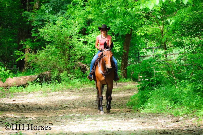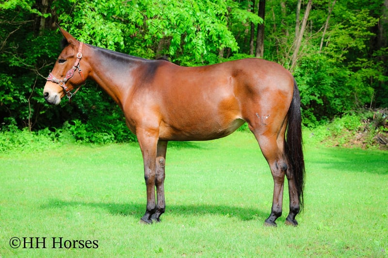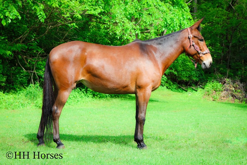 ONLINE AUCTION Place your bids at www.PlatinumEquineAuction.com Starting Bid $3500 Auction ends June 1st, 2025 Need a new saddle? Check out White Rock Saddles on our website or Facebook! This is “JADA”, one exceptionally well trained, seasoned, and experienced BAY MOLLY MULE that has been shown in reining, ranch pleasure, trail classes, and halter. This mule is extremely well broke, gentle, honest, and safe. She has been trail ridden all over the mountains by a lady in her late 60’s. She has been a one owner mule and been well taken care of. She has won many blue ribbons in many different classes. She has been ridden English and Western. This mule will sit down and turnaround, slide stop, side pass, ride around collected and correct, and stand to mount, tack, and groom. She has impeccable ground manners, loads, bathes, and hauls with no issues. She rides out alone, crosses water, handles rocky steep terrain, and will go anywhere you point her. She is traffic safe, not spooky, and so much fun to ride. She is 10 years old and stands 16.1 hands tall. If you want a mule that any level rider can get on and get along with, here she is. She will make a beginner look like a professional. She is quiet, safe, patient, kind, and honest. Contact HH Horses Erin 304-238-4155 with any questions, to make a Buy It Now Offer or to set up a time to come see her. ONLINE AUCTION Place your bids at www.PlatinumEquineAuction.com Starting Bid $3500 Auction ends June 1st, 2025 Need a new saddle? Check out White Rock Saddles on our website or Facebook!