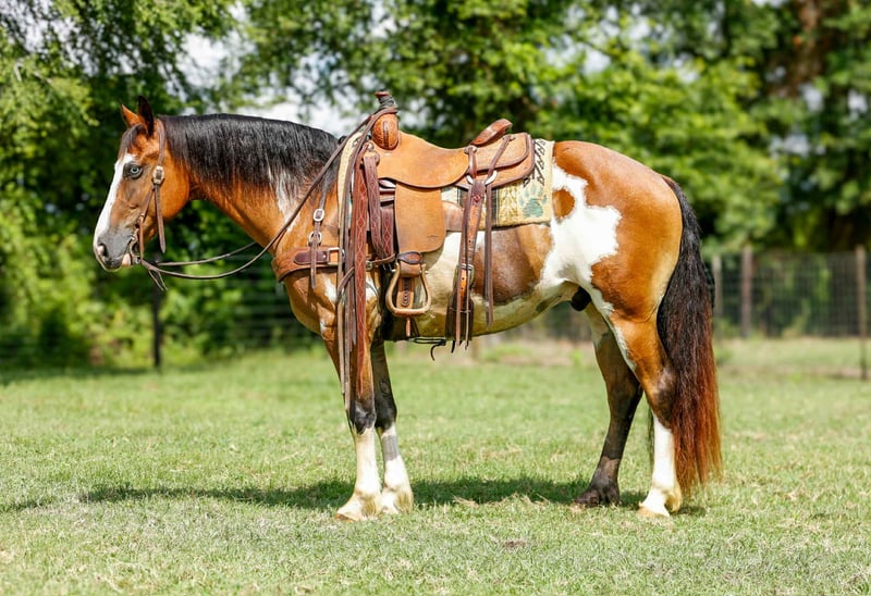 ONLINE AUCTION Place your bids at www.PlatinumEquineAuction.com Starting Bid $3500 Auction ends August 3rd, 2025 Need a new saddle? Check out White Rock Saddles on our website or Facebook Benji is a 10 year old gypsy cross gelding, standing 14.3 hands tall and is as flashy as they come! If your looking for a horse that combines beauty, brains, and a gentle temperament? Look no further! This eye-catching gelding boasts the striking color of a Paint with the sturdy build and flowing feathering of a Gypsy Vanner! Benji has been trail rode all over, he goes wherever he is asked, crosses the creeks, logs and bridges great! He has also been around cattle for basic ranch work such as gathering and penning. Benji has also spent a little time in the arena, he is soft in the face, he has a willing attitude and smooth gaits. Whether you’re looking for a trail partner, a dressage prospect, or a stunning addition to your family, this gelding has the potential to excel in any discipline. Don’t miss the opportunity to own this exceptional crossbred gelding! If you would like to schedule a time to come meet and ride Benji , or have any other questions about Benji feel free to reach out! ☎️ Rachel , 605-370-4644. Benji is located in Rusk TX, we can also help arrange shipping nationwide! ONLINE AUCTION Place your bids at www.PlatinumEquineAuction.com Starting Bid $3500 Auction ends August 3rd, 2025 Need a new saddle? Check out White Rock Saddles on our website or Facebook