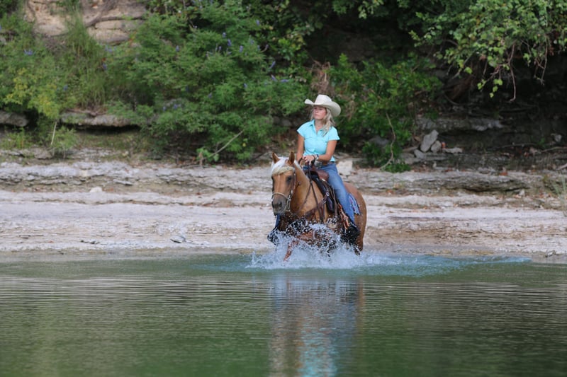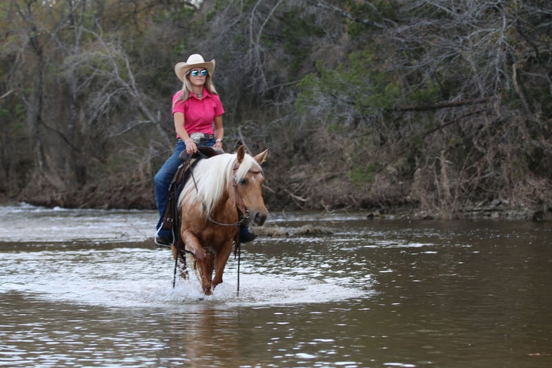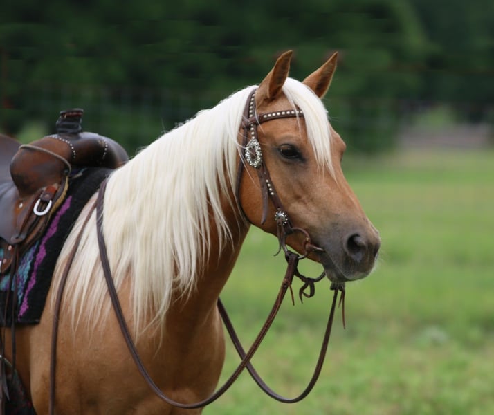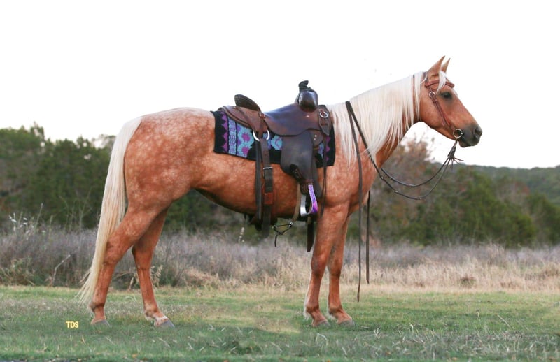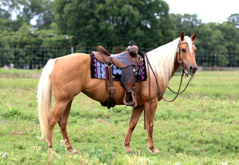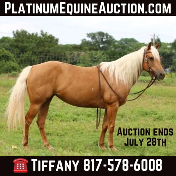 ONLINE AUCTION Place your bids at www.PlatinumEquineAuction.com Starting Bid $3500 Auction ends July 28th, 2024 Need a new saddle? Check out White Rock Saddles on our website or Facebook! Golden Chick “Goldie” is a 10 year old gorgeous Quarter Pony mare. This sweet girl will get you noticed anywhere with her flowing blonde mane and tail; she’s a compact ultimate Barbie Dream Horse. She is the first one to greet you and loves being around people. She has been ridden both English and Western, has packed young kids and small adults and trail ridden everywhere. She is confident wherever you point her from parades to rivers to playdays. She is 14h tall but stout built and can keep up with the big horses all day. Goldie is good alone or with a group and is user friendly. She stands great for the farrier, to be groomed/bathed, and to be saddled. Loads great and will back out to unload herself. Easy keeper, up to date on everything and is 100% sound. Located in Stephenville, TX, please call/text Tiffany Smith 817-578-6008 to come meet Miss Golden Chick! ONLINE AUCTION Place your bids at www.PlatinumEquineAuction.com Starting Bid $3500 Auction ends July 28th, 2024 Need a new saddle? Check out White Rock Saddles on our website or Facebook!