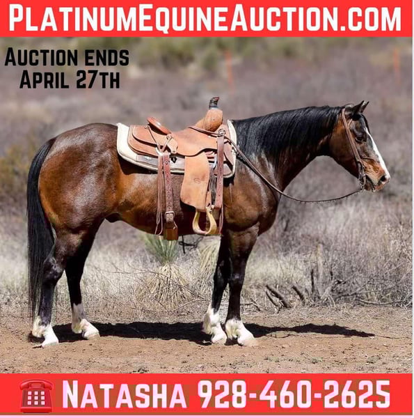ONLINE AUCTION Place your bids at www.PlatinumEquineAuction.com Starting Bid $3500 Auction ends April 27th, 2025 Need a new saddle? Check out White Rock Saddles on our website or Facebook! Jacks Royal Sunshine aka “Sunny” is a 2014 model APHA registered gelding standing 14.2hh. This magnificent gelding will go absolutely any direction you point him, making him a great trail horse!! Vast flowing rivers, fallen logs, thick brush, rough rocky country, steep slippery slopes, the busy streets of town, you name it and Sunny will mosey right on through it! Sunny is not only an absolute blast to ride outside, he’s just as fun in the arena too! He will walk, trot, and lope both ways with ease. Sunny is easy to catch and good to groom, saddle, bridle, bathe, trim, and load!! Will come with a clean coggins and health! Transport can easily be arranged anywhere in the US!!! Located in Camp Verde, AZ. Contact D/C Equine Services Dallas 804-822-2233 Natasha 928-460-2625 ONLINE AUCTION Place your bids at www.PlatinumEquineAuction.com Starting Bid $3500 Auction ends April 27th, 2025 Need a new saddle? Check out White Rock Saddles on our website or Facebook!