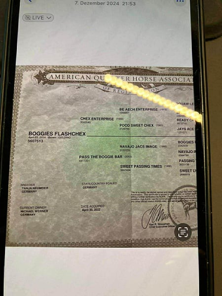 Due to personal reasons, I am reluctantly selling my Quarter Horse gelding, "Boggies Flashchex," affectionately known as Rudi. Rudi will turn 12 years old in April and is an all-rounder par excellence! He is equally comfortable riding alone or in a group (see photo) in the terrain. He is completely road and traffic safe and is not easily spooked by anything. He also performs confidently at competitions. My wife has ridden him in various ranch disciplines. He masters all maneuvers that a well-trained Western horse should be capable of. Rudi stands approximately 1.50 meters (15 hands) tall and has never been ill or lame during our time together. Currently, he is in an active stable with a mixed herd. I would prefer a paddock stall for Rudi, as he greatly enjoys the company of his equine friends. Rudi is only available to responsible, non-dealer buyers. His tack (saddle, bridle, etc.) can be purchased separately upon request. Location: 94431 Pilsting