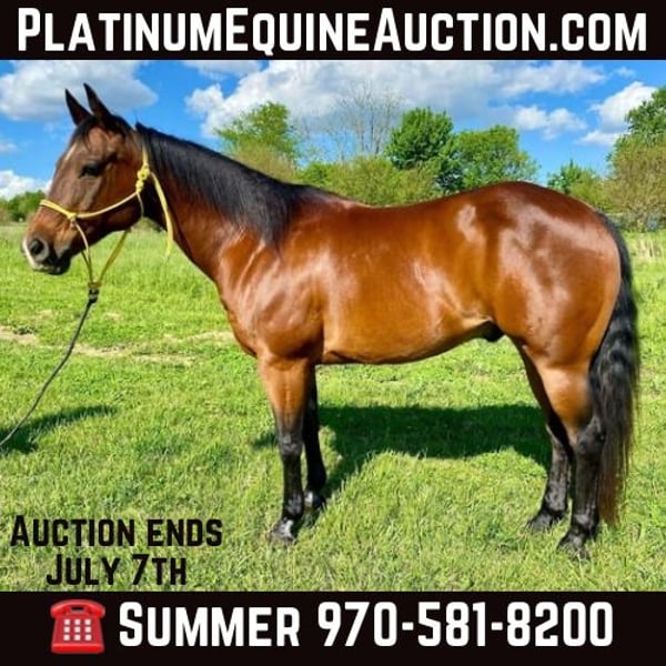 ONLINE AUCTION Place your bids at www.PlatinumEquineAuction.com Starting Bid $3500 Auction ends July 7th, 2024 Need a new saddle? Check out White Rock Saddles on our website or Facebook! This bay Ranch-type Gelding is approximately 10 year old and stands 15H. Buddy is a lovely bay with a kind expression, big body, and solid constitution. He can be fancy and do many ranch horse specialties such as side passes, spins, self loads on the trailer, and ground ties. He can also be the penultimate Family horse and be a Trail horse deluxe, has a slow lope, neck reins, and over all baby sitter. Buddy has great, bare feet, super for the Farrier, an easy keeper, baths/clips, low on the pecking order in a group, and will stand tied all day. He is currently being used as a Family/Pleasure/Trail horse. Located in Danville, IN. Contact Summer Landry 970-581-8200 with any questions. ONLINE AUCTION Place your bids at www.PlatinumEquineAuction.com Starting Bid $3500 Auction ends July 7th, 2024 Need a new saddle? Check out White Rock Saddles on our website or Facebook!