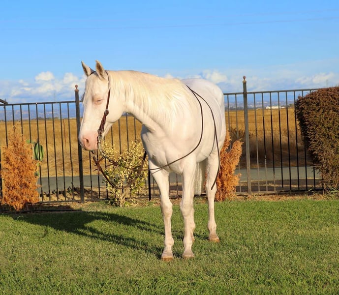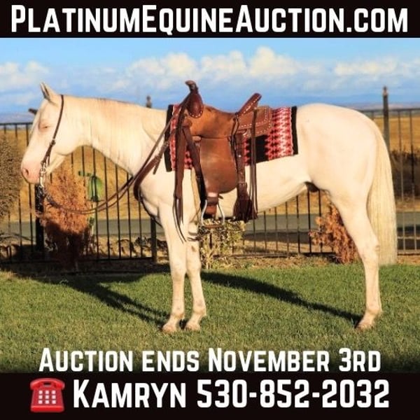 ONLINE AUCTION Place your bids at www.PlatinumEquineAuction.com Starting Bid $3500 Auction ends November 3rd, 2024 Need a new saddle? Check out White Rock Saddles on our website or Facebook! Meet Blizzard a 10 year old, 15h, Cremello, grade Quarter Horse gelding. He is the most beautiful and sweetest horse you could ever dream of owning! With his been-there, done-that attitude, Blizzard is a steady and reliable companion for all your riding adventures. Whether you’re cruising down trails or working in the arena, or cruising the city streets, he makes everything feel effortless. Blizzard is an experienced trail horse who can handle anything you throw at him. He’s crossed creeks, bridges, rocky terrain, and muddy paths with ease. His sure-footedness ensures he never rushes, taking his time to carefully navigate steep hills, making him the easiest ride on any trail. Blizzard has encountered all sorts of obstacles – from pool noodles to tarps, swaying bridges, and streamers, livestock, wildlife, bikes, strollers, guns, smoke, heavy equipment– and hasn’t blinked an eye. He’s even had guns shot off of him, remaining calm and steady the whole time. If you’re looking for a horse who can do it all, Blizzard is your guy. In the arena, Blizzard is extremely well-broke and responsive. He knows his leads, has a fantastic stop, backs up, side passes, and neck reins with ease. His gaits are incredibly smooth, so much so that you could canter on him all day, feeling like you’re floating on a cloud. One of his most impressive qualities is his ability to ride just as well bridleless as he does with a bridle. His training and natural temperament make him the type of horse you can let sit for weeks, and he’ll ride off like you worked him yesterday. Blizzard has been ridden in all kinds of weather, including rain and high winds, and handled it all like a champ – no bridle, no problem. He’s one of the rare few horses I can fully trust in any condition. Blizzard is also a dream to have around the ranch, making him the perfect family horse. He stands patiently for saddling, grooming, baths, and the farrier, and he loads and unloads easily, never rushing in or out of the trailer. Blizzard is hands down the easiest horse we have ever owned. Don’t miss out on this incredible gelding – he’s ready to be your next all-around family horse or ranch partner! Reach out for more information or to schedule a visit to meet Blizzard. Please contact Kamryn at KW Ranch 530-852-2032 Located in Pleasant Grove, CA. ONLINE AUCTION Place your bids at www.PlatinumEquineAuction.com Starting Bid $3500 Auction ends November 3rd, 2024 Need a new saddle? Check out White Rock Saddles on our website or Facebook!