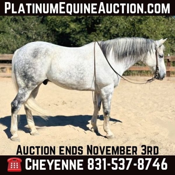 ONLINE AUCTION Place your bids at www.PlatinumEquineAuction.com Starting Bid $3500 Auction ends November 3rd, 2024 Need a new saddle? Check out White Rock Saddles on our website or Facebook! Hammer is here to be your Prince Charming! He looks like he fell straight out of a fairytale. Standing over 15.2HH, thicker than a ox, and only 10 years old! Hammer is extensively broke and is just as dreamy to ride as he is to look at! He is a big easy going guy and never gets in a rush about anything. He’s been out on every type of trail known to man, through water, and down busy highways. Hammer doesn’t ever blink an eye at any commotion. He stays quiet as the day is long. Anyone, no matter their experience horse back, can get along with him. He is patient, calm, and sane every second. He has the best ground manners, stands tied anywhere, doesn’t move a muscle while getting a bath or tacking up. Hammer will always be the easiest horse to catch anywhere you put him. He loves his people and has a great in your pocket personality. In the arena, he’s rides one handed, moves off leg pressure, and has a super light feel to him. He picks up each lead correctly and is smooth in his gaits. He has been in parades, been used out on the farm around cattle and down busy beaches. If you can think of it, Hammer has seen it! He lets you clip his ears and face, picks his feet up with a tap on the leg, and hauls great! Hammer is the perfect horse for anyone, he would make a great addition to every family! He is located in Bitterwater, CA. for more information or to come see him please contact Cheyenne Rey 831-537-8746. ONLINE AUCTION Place your bids at www.PlatinumEquineAuction.com Starting Bid $3500 Auction ends November 3rd, 2024 Need a new saddle? Check out White Rock Saddles on our website or Facebook!