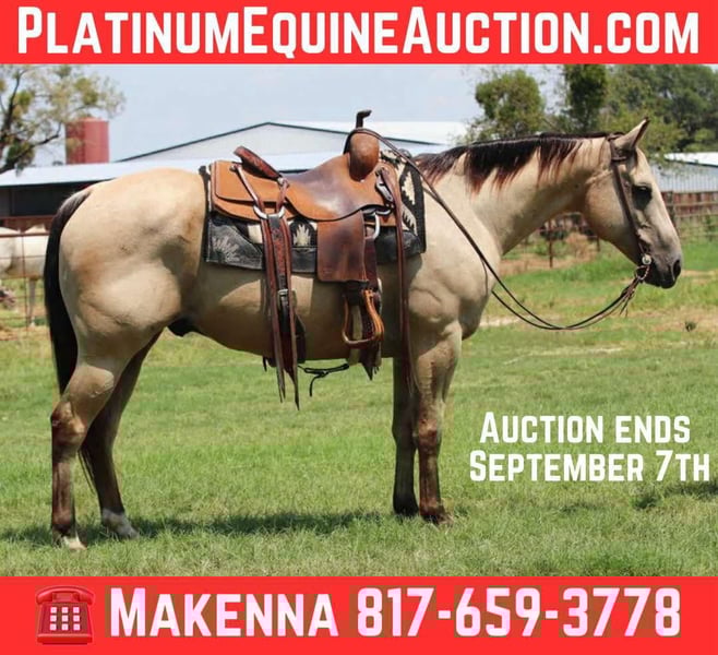ONLINE AUCTION Place your bids at www.PlatinumEquineAuction.com Starting Bid $3500 Auction ends September 7th, 2025 Need a new saddle? Check out White Rock Saddles on our website or Facebook Here’s one that’s as dependable as he is good-looking. Beamer is a 12-year-old grade gelding stands 15 hands tall and comes in America’s favorite color—buckskin. He’s the kind that gets noticed wherever you take him, with the temperament and training to back it up. He is absolutely gentle and very broke. Smooth, steady, and easy-going, he makes every ride comfortable and enjoyable. He knows all his gaits, picks them up willingly, and carries himself with a relaxed, natural style. Out on the trails, he’s confident and surefooted, happy to go wherever you point him without a fuss. In the arena, he stays consistent and uncomplicated, making him a solid all-around partner for pleasure riding. On the ground, he’s well-mannered and respectful—easy to catch, tack, and handle. Beamer’s the kind you can count on to stay the same every time you saddle him up. 📌 12 years old 📌 Grade gelding 📌 Buckskin 📌 15 hands tall 📌 Gentle, broke, and extremely smooth 📌 Trail and arena ready Beamer is the full package—safe, broke, and good-looking. If you’re looking for a reliable partner you can enjoy anywhere, he’s the kind that will fit the bill. We are located in Lipan, TX. We have reputable haulers that go all over the country, including Hawaii and Canada. Give me a call or text and I’d be happy to answer any questions! Makenna Hartzell 817-659-3778. ONLINE AUCTION Place your bids at www.PlatinumEquineAuction.com Starting Bid $3500 Auction ends September 7th, 2025 Need a new saddle? Check out White Rock Saddles on our website or Facebook