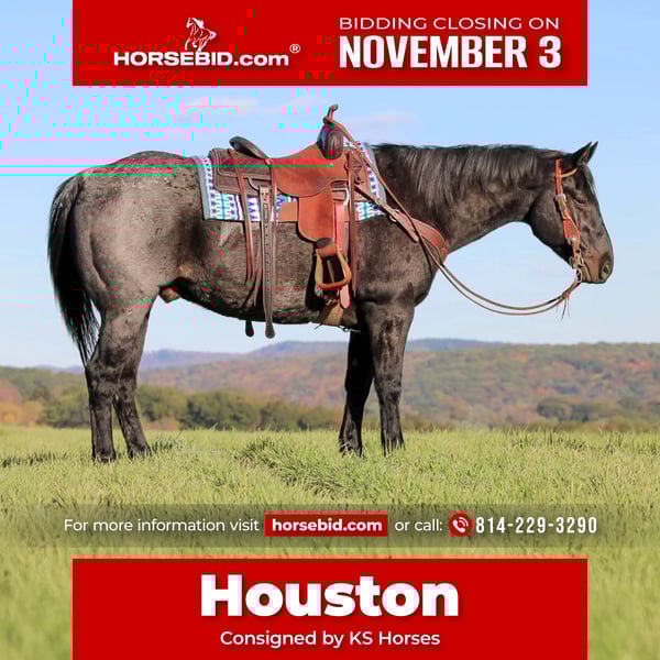 ⚜️𝐓𝐇𝐄 𝐅𝐀𝐋𝐋 𝐇𝐄𝐑𝐈𝐓𝐀𝐆𝐄 𝐂𝐋𝐀𝐒𝐒𝐈𝐂⚜️ Happening now thru MONDAY | NOVEMBER 3rd - Available EXCLUSIVELY on HorseBid's website! For more details and to register visit: www.Horsebid.com CONSIGNOR CONTACT: KS Horses 814-229-3290 LOCATION: Clarion, PA BREED: QH REGISTERED: No COLOR: Blue Roan HEIGHT: 15 AGE: 12 GENDER: Gelding Houston is a 12-Year-Old Blue Roan Quarter Horse Gelding. He stands 15 hands tall and is very stocky and built to carry any size rider. If you been looking for that all around safe, quiet and gentle all-around horse then be sure to check out Houston. Houston is super easy to ride and has always rode very safe for us. I have had beginners on him, and they did great on him. He is a great trail horse. He goes anywhere you ask him to on the trail without hesitation. Thru the mud, over the logs and across the creeks. Very seasoned been there done that trail horse. Houston has worked on a ranch and knows what a honest day's work is. He has done it all on the ranch from working cattle, roping and doctoring cattle, checking fences to being a guest horse on the ranch. He also rides nicely in the arena. He is jack of all trades. He is that great blue roan color and is very good looking. He is friendly and loves to be petted and rubbed on. You will like how easy Houston is to ride. Just saddle him up and go enjoy a nice relaxing ride. On October 21st Houston has a vet check done where he passed everything. You can check out the health evaluation in the pictures. Don't miss out on this super nice all around good broke gentle blue roan gelding. We can help arrange shipping anywhere in the United States. Call or Text Kris at 814-229-3290 Thank You and God Bless