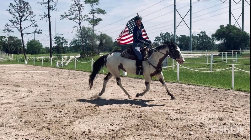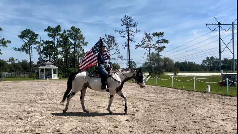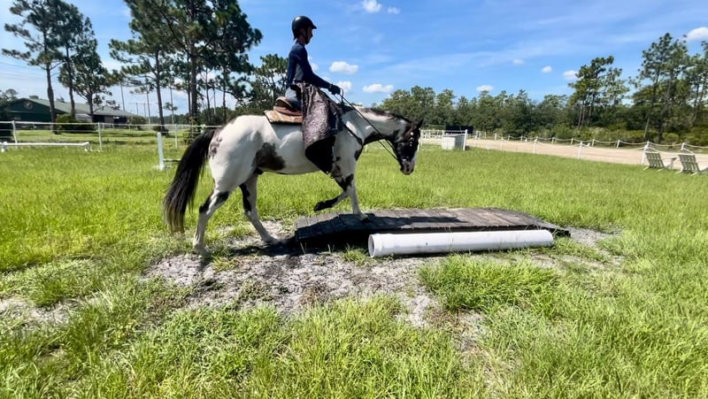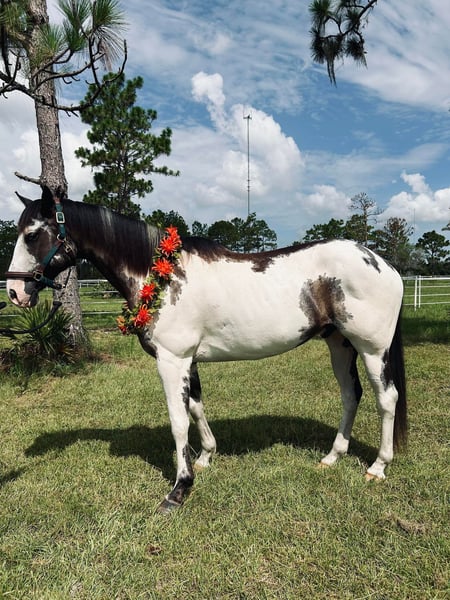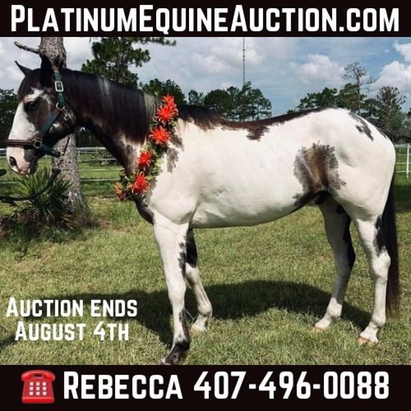 ONLINE AUCTION Place your bids at www.PlatinumEquineAuction.com Starting Bid $3500 Auction ends August 4th, 2024 Need a new saddle? Check out White Rock Saddles on our website or Facebook! Domino is your next flashy dream horse! He is an 11yr old registered paint gelding standing at 16.1hh. This easy going guy is a kick ride, and can go either way English or Western. He enjoys being worked and have a job, you can take him for a swim bareback or hack out with friends. His quirky personality is a joy to have at the barn. Very willing and trusting of his rider to try new things, he does need an experienced rider. He has a very smooth trot and great lateral movement – check out his awesome video! He ties, loads and stands for farrier with some treats. Next shod scheduled for 7/19/24. UTD on all shots and coggins. Ready for his forever home. Please do not hesitate to reach out via text or phone at Rebecca Rodriguez 407-496-0088 for any additional information or questions! Located in Christmas, FL. ONLINE AUCTION Place your bids at www.PlatinumEquineAuction.com Starting Bid $3500 Auction ends August 4th, 2024 Need a new saddle? Check out White Rock Saddles on our website or Facebook!