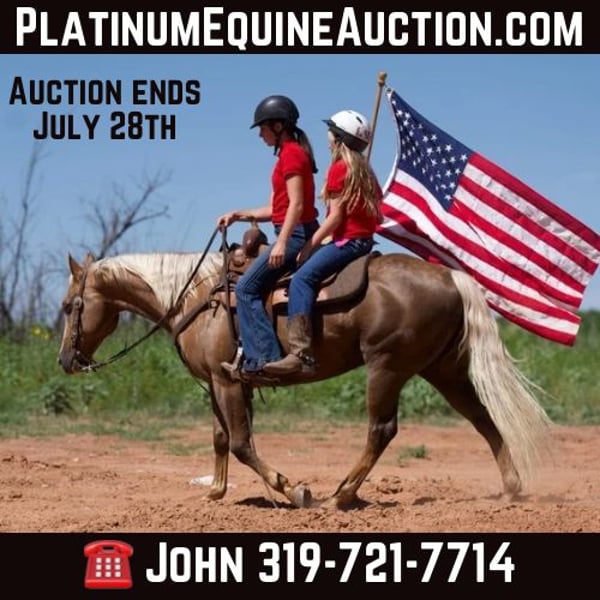 ONLINE AUCTION Place your bids at www.PlatinumEquineAuction.com Starting Bid $3500 Auction ends July 28th, 2024 Need a new saddle? Check out White Rock Saddles on our website or Facebook! Hiatt Chocolena Gold – barn name “Hyatt” he is a 12 year-old registered chocolate Palomino with a white main and tail. He will stand 14.3 hands tall and is a muscular 1200 pounds. He has great confirmation and he has a very pretty head. He is definitely an eye catcher! Hyatt rides with an old-fashioned one hand neck rein. I have used Hyatt in my lesson program for the past year and have had multiple different levels of riders take lessons on him. He has been used in 4H and local horse shows. He excels in disciplines like halter, walk trot, ranch horse, pleasure, and trail class. Hyatt crosses anything on the trail such as ditches, logs, mud puddles, & rocks. Wyatt is also very traffic safe. He has been rode on major highways where there’s tractors, semi’s, motorcycles, four wheelers and bicycles! Hyatt is an excellent overnight camping trail horse. He stands next to the trailer with no problems. He has even been rode next to the train tracks. He is not spooky or shy from different types of terrain. He has been rode in Matzel game reserve around wild life! He has also been ridden in large bodies of water, like rivers and lakes. He has been trail ridden in Palo Duro Canyon by an 11-year-old girl. He is very surefooted! Hyatt has also been around cattle. Hyatt’s ground manners are impeccable and he stands like a statue for the Farrier and to saddle, mount and dismount. He trailers well and he is broke to hobble on a picket line! He loads and unloads in any type of trailer with no hesitation ! Hyatt is one of the easiest horses to catch. He loves to be bathed brushed and picks up his feet automatically. He is 100% sound in every way mind, body and spirit. He loves attention and he is good in a stall or in pasture.! Hyatt has no bad habits like cribbing, weaving or pacing. He is a true all around family horse for everyone to ride and enjoy. We have also used Hyatt to break young Colts and to Pony/exercise our older horses, tons of videos and pictures available. Located in Lisbon, IA. Contact John McPhail 319-721-7714 with any questions. ONLINE AUCTION Place your bids at www.PlatinumEquineAuction.com Starting Bid $3500 Auction ends July 28th, 2024 Need a new saddle? Check out White Rock Saddles on our website or Facebook!