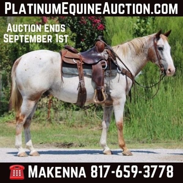 ONLINE AUCTION Place your bids at www.PlatinumEquineAuction.com Starting Bid $3500 Auction ends September 1st, 2024 Need a new saddle? Check out White Rock Saddles on our website or Facebook! He’s got a set of eyebrows and a cool looking color to go with them. Eyebrows is a 12 year old gelding standing 14.3hh tall and stout! He is very gentle and easy going, perfect for someone wanting to learn or just go slow and steady! He enjoys trail riding and doesn’t mind going everyday or once a month! Lasts all day long and never misses a beat. Brows is a great addiction to any family, especially if you’re needing a new family member on a budget. Come see him for your self or we can help you arrange shipping all over the country, Hawaii and Canada as well. Located in Stephenville TX. For more information Contact Makenna Hartzell 817-659-3778. ONLINE AUCTION Place your bids at www.PlatinumEquineAuction.com Starting Bid $3500 Auction ends September 1st, 2024 Need a new saddle? Check out White Rock Saddles on our website or Facebook!