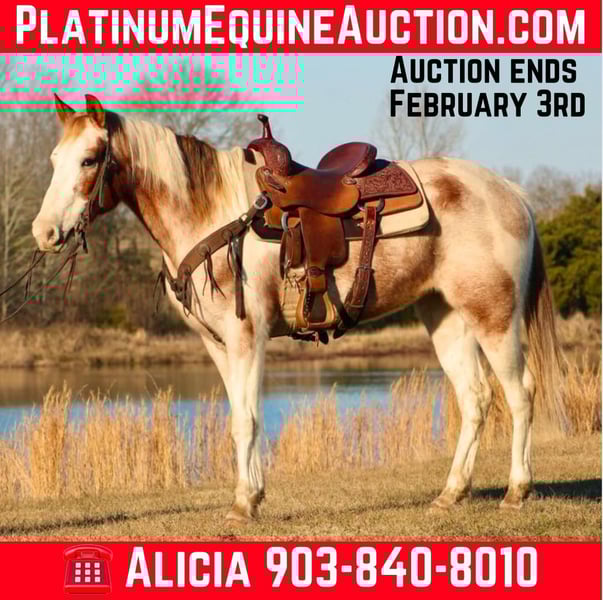 ONLINE AUCTION Place your bids at www.PlatinumEquineAuction.com Starting Bid $3500 Auction ends February 3rd, 2025 Need a new saddle? Check out White Rock Saddles on our website or Facebook! If you are looking for a sweet trail partner with lots of flash B.B. is your girl. She is a 13 year old roan and white paint mare. She stands 14.3 hands tall. B.B is no stranger to trail riding she’s gone hundreds of miles thru all types of terrain and is totally unflappable. She is sure footed and does not spook. She will go wherever you point her head without a second thought. B.B has also done Christmas parades with her previous family. We have done some cattle work with her and she seems to really enjoy that as well. B.B has an excellent personality, sweet demeanor and no bad habits or vices. She does not require shoes or any maintenance. B.B is truly one that the whole family will love and enjoy! If you have any questions please call or text Alicia Darling 903-840-8010 Located in Canton, TX. ONLINE AUCTION Place your bids at www.PlatinumEquineAuction.com Starting Bid $3500 Auction ends February 3rd, 2025 Need a new saddle? Check out White Rock Saddles on our website or Facebook!