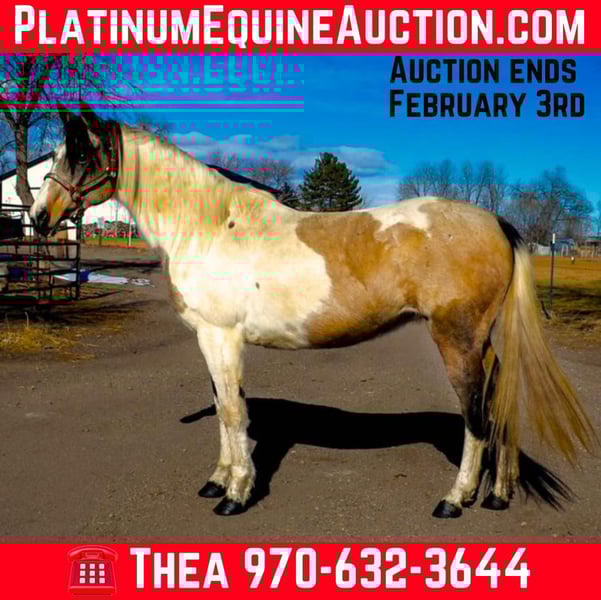 ONLINE AUCTION Place your bids at www.PlatinumEquineAuction.com Starting Bid $3500 Auction ends February 3rd, 2025 Need a new saddle? Check out White Rock Saddles on our website or Facebook! Lululemon (aka Lulu) is a 13 year old, 15hh buckskin paint mare that is one of the smartest mares out there! You could literally teach this mare algebra if you wanted to. She is eager to please, LOVES games (or anything new to learn) and is an absolute gem to be around on the ground and in saddle! (Not to mention built well and absolutely stunning!) Lulu was trained by a level 4 parelli student and has EXTENSIVE Talent and skills in the parelli world! , you can point her around an obstacle course with just your finger or lunge outside of the arena with just your voice and body language, on top of hundreds of little games she knows (and a bow!) Lulu is also an extreme athlete and excels in the cross country, hunter jumper and eventing world! This mare has never refused a jump and has incredible endurance, athleticism, scope and tuck! Lulu is well versed on trails too! Whether you’re going on a long mountain trip or a quick ride through town she is up for the adventure! She is very used to crazy and chaotic scenes and there is nothing on the trail that could spook her! We have also done some western pleasure and western dressage training with Lulu which she has taken a liking too and picked up on quickly! She is an extremely fancy mover with a great headset and very supple bodied. No matter what you want to do this mare is up for the job and extremely capable. Watch her video and come see how incredible Lulu truly is! Call Dynamite Horses Thea 970-632-3644 with any questions. Located in Fort Collins, CO. ONLINE AUCTION Place your bids at www.PlatinumEquineAuction.com Starting Bid $3500 Auction ends February 3rd, 2025 Need a new saddle? Check out White Rock Saddles on our website or Facebook!