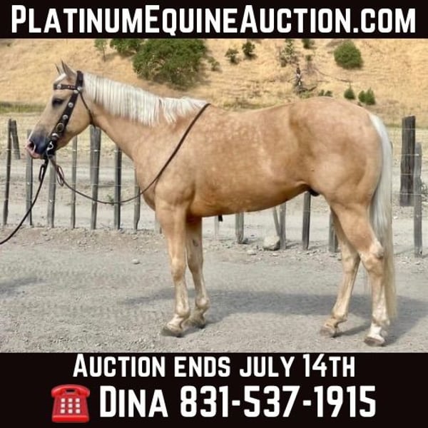 ONLINE AUCTION Place your bids at www.PlatinumEquineAuction.com Starting Bid $3500 Auction ends July 14th, 2024 Need a new saddle? Check out White Rock Saddles on our website or Facebook! Butter is a horse that will melt your heart with his sweet disposition and kindness. He is 12 year old, 15 hand, fancy eye catching golden boy. This is one of the easiest horses to ride and is absolutely magnificent. He is extremely calm and capable of doing anything you can ask. He is a superb trail mount with his no nonsense attitude and approaches everything with confidence and gentleness. Whether you want to hit the town with friends or take a scenic stroll around the neighborhood you can count on butter to be reliable and safe. This horse is VERY unflappable and will go absolutely anywhere. He will cross the deepest water, navigate narrow trails, walk over downed trees, and has seen tons of wildlife. There will be nothing that he hasn’t seen. Butter will navigate any obstacle with ease and quietness. He has seen swinging balls, flying tarps, crosses bridges, logs, carries flags you name it he can do it. He is unfazed by cars, trucks, road work, and even statue dinosaurs. He is professionally broke in the arena will maintain his quiet easy going disposition. He will have correct circles, with a nice collected headset to match his smooth as butter transitions in his movements. He is one you can trust with all level riders. He is the whole package! AARP approved. He is a solid ranch gelding who has taken the most delicate riders out and will babysit them but is so versatile that the top hand can do any task on him. Butter has been started roping and is doing great. He is the perfect horse to learn and grow on. He will take care of his rider and will adjust himself accordingly. This horse is a saint and truly irreplaceable. He has been a joy to have the pleasure owning and will be missed. Butter has the ability to teach and help build confidence to new riders which makes him a remarkable family horse. Butter is great to be around great for veterinarian visits, stands patiently tied. Loves to be groomed, and enjoys being around his people. He is very polite and respectful. Butter has so much to give with his knowledge and kindness. He will ride bareback, double and in halter with ease. He is easy to trailer, good with other horses, and pastures or stalls nicely. I cannot say enough good things about this horse he is one of a kind. Butter is definitely a universal horse that anyone can easily ride. There is so much he has to offer making him one you don’t find available often. If you would like to come meet me Butter please contact Longhorn Ranch Dina 831-537-1915 Located in Paicines, CA. ONLINE AUCTION Place your bids at www.PlatinumEquineAuction.com Starting Bid $3500 Auction ends July 14th, 2024 Need a new saddle? Check out White Rock Saddles on our website or Facebook!