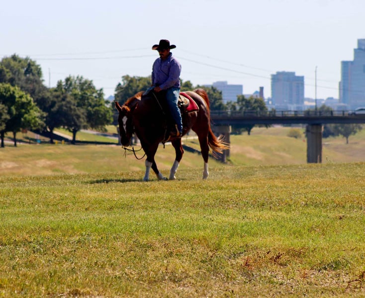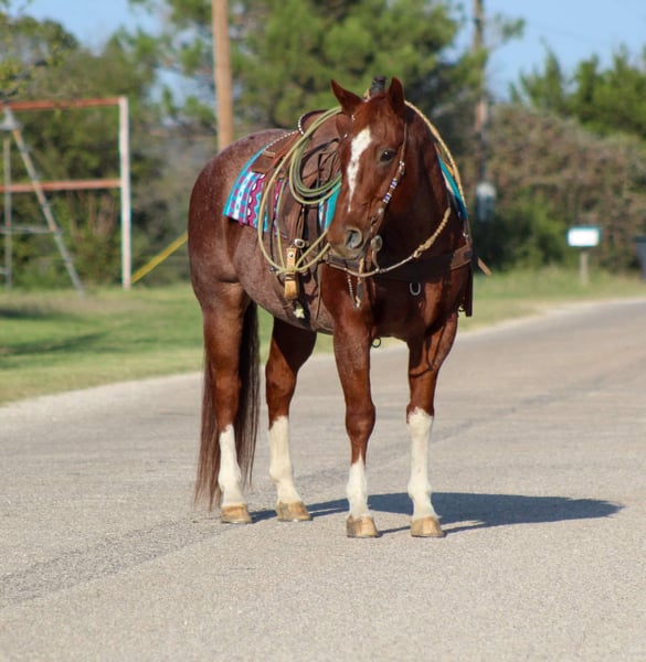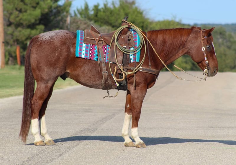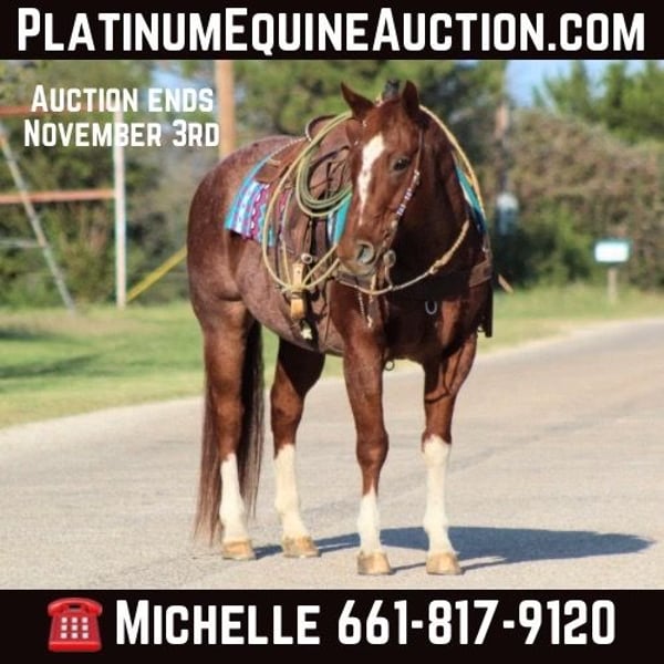 ONLINE AUCTION Place your bids at www.PlatinumEquineAuction.com Starting Bid $3500 Auction ends November 3rd, 2024 Need a new saddle? Check out White Rock Saddles on our website or Facebook! Concho is a 12 year old STOUT made red roan gelding standing 15.1 hds tall. They just don’t come built like this guy anymore! Hes old school! Concho is a one handed broke true bridle horse. He has been used extensively on a ranch his whole life and knows what a long days of work is. Concho has been used for all the ranch chores all while being a fancy broke kind of guy showing off his skills. He has also been to open horse shows, 4H shows, and ranch riding shows. He has a smooth little nice short lope to him and will lope right out of his tracks. In the arena he will walk, trot, and lope gorgeous circles. Concho is an excellent trail blazer partner and LOVES to hit the trails. He is always down to go on adventures and is happy to do it. He has been rode on many types of trails in different terrain from the steep mountains in Wyoming and Montana to the flat lands of Texas. Concho is happy to cross logs, brush , rivers or creeks . He will go up and down hills no issues at all. This guy is safe for ALL levels of riders from your true beginners to the most experienced horseman. Hes one everyone will enjoy. Concho is a sweet gentle kind soul from the ground to his back. I guarantee his NEW owners are gonna love him just like we do. Contact us to come try him, or we can set up a FaceTime also. If you need help with transport don’t hesitate to ask we have a list of reputable haulers that can get him safely to your doorstep world wide. Located in Stephenville, TX. Contact M$ Performance Horses Michelle 661-817-9120. ONLINE AUCTION Place your bids at www.PlatinumEquineAuction.com Starting Bid $3500 Auction ends November 3rd, 2024 Need a new saddle? Check out White Rock Saddles on our website or Facebook!