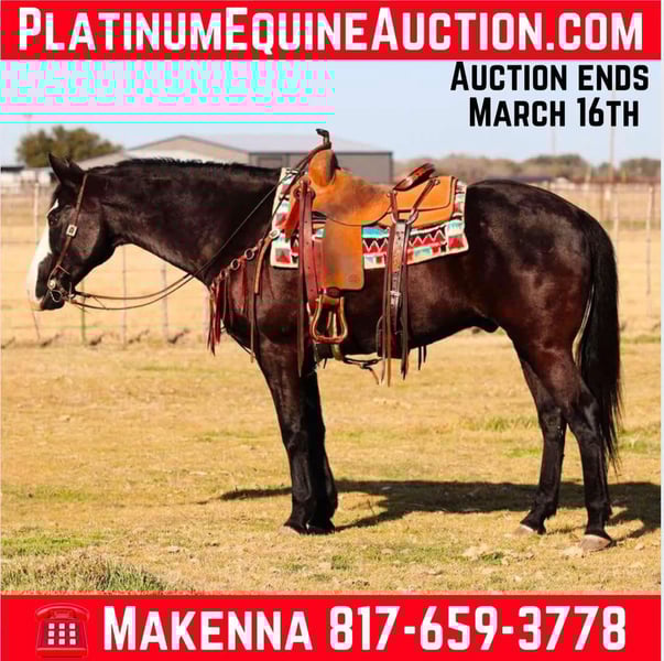 ONLINE AUCTION Place your bids at www.PlatinumEquineAuction.com Starting Bid $3500 Auction ends March 16th, 2025 Need a new saddle? Check out White Rock Saddles on our website or Facebook! Check out this amazing gelding we have had the opportunity to offer to the public, Deputy! At only 13 years old and 15.2h this gelding is ready to find his forever family! Nothing phases this guy as he is always eager to do is job. This horse not only looks majestic, but he rides like it too. Walk, trot, lope, this horse moves like a dream. He even rides English! The kind of a horse that you can show off to all of your friends. This is the ultimate gift for any family member, as he is gentle and safe for all ages! Deputy is well broke, does whatever is asked of him no matter what, he makes it fun! This is the perfect trail horse, as he doesn’t have a care in the world, loves just to go all day with his person. He rides great in the arena, knows both his leads, has a smooth trot as well! I could write a book about him all day but he speaks for himself! Watch his video below, we even spent a day taking Deputy through the historic downtown Fort Worth Stockyards! He has even been roped on a bit as well! No matter how busy your life may get, Deputy is always ready to saddle up and ride off without a care in the world! He will always meet you at the gate, especially with a little cookie interruption. Located in Lipan, TX. We can help arrange hauling anywhere in the US, Hawaii or Canada! Please call or text Makenna Hartzell 817-659-3778. ONLINE AUCTION Place your bids at www.PlatinumEquineAuction.com Starting Bid $3500 Auction ends March 16th, 2025 Need a new saddle? Check out White Rock Saddles on our website or Facebook!
