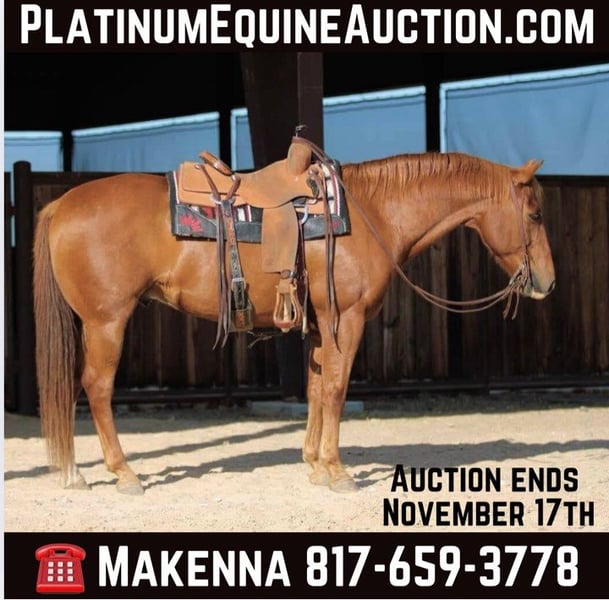 ONLINE AUCTION Place your bids at www.PlatinumEquineAuction.com Starting Bid $3500 Auction ends November 17th, 2024 Need a new saddle? Check out White Rock Saddles on our website or Facebook! The first thing people notice about Big John is that he is shapey with a big soft kind eye and he has a cool ranchy look about him that always gets attention. He’s also a hard to find size with great substance and presence, along with sturdy bone allowing him to go all day long. Big John has all the skills to be your best trail buddy or family horse. He will cross water, go over logs, through deep brush, and navigate bridges without having to ask him twice. He rides out alone or in a group with impeccable manners. He will tolerate any human shenanigans trail riding may bring out. In a saddle or bareback, he doesn’t care. Completely unbothered around dogs, vehicles, farm equipment and UTVs, even when they invade his personal space. John even handled the busy downtown Fort Worth Stockyards. Loads and unloads without drama. You can pick up all 4 feet easily. Good in a stall or in a pasture with other horses. He stands 15.3hh tall and weighs 1400lbs and just 12 years old! Located in Lipan, TX. We can help arrange hauling anywhere in the US, Hawaii or Canada! Please call or text Makenna Hartzel 817-659-3778 for more information. ONLINE AUCTION Place your bids at www.PlatinumEquineAuction.com Starting Bid $3500 Auction ends November 17th, 2024 Need a new saddle? Check out White Rock Saddles on our website or Facebook!