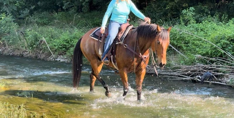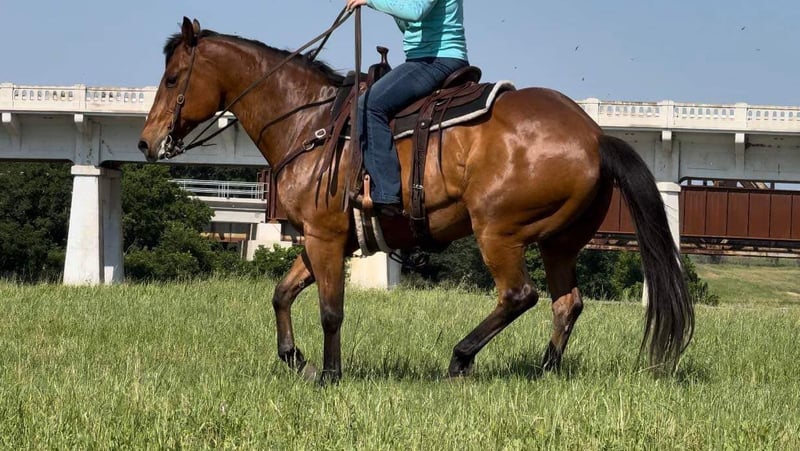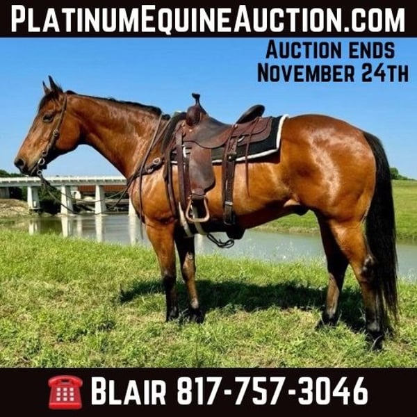 ONLINE AUCTION Place your bids at www.PlatinumEquineAuction.com Starting Bid $3500 Auction ends November 24th, 2024 Need a new saddle? Check out White Rock Saddles on our website or Facebook! Bo is a 12 yr old, 16H bay quarter horse gelding. The phrase built like a brick house, started when they saw this gelding. Bo is as stout as they come but he has the softest personality. He is an extremely GENTLE giant and is suitable for all ages and abilities! He was used on a ranch years ago and since he’s just been an old lady’s trail horse. Bo has a nice handle to him and is definitely broke like a fancy one should be. He neck reins with ease and moves off leg beautifully. He opens/closes gates and would be a trail riders dream! He takes to all new situations with ease. He has ZERO buck, bolt, spook or rear and tackles any obstacles he encounters. Bo crosses water, railroad tracks, loud echoey bridges and is absolutely traffic safe! He is incredibly easy to ride and anyone that can hold the reins can ride this guy! We can’t say one negative thing about him, if you’re looking for a no brainer, beer drinking, kick back and relax type horse, you absolutely don’t want to miss Bo! He loads, leads, bathes and ties great. He has the best, lovable personality and will surely become someone new best friend the minute they meet him. Go to his website page northtexashorsecompany.com/bo for more pictures and footage! Please call Blair with North Texas Horse Company for more info at 817-757-3046. We LOVE to talk about him! We are located in Weatherford, TX and can help arrange affordable shipping to anyone!! ONLINE AUCTION Place your bids at www.PlatinumEquineAuction.com Starting Bid $3500 Auction ends November 24th, 2024 Need a new saddle? Check out White Rock Saddles on our website or Facebook!