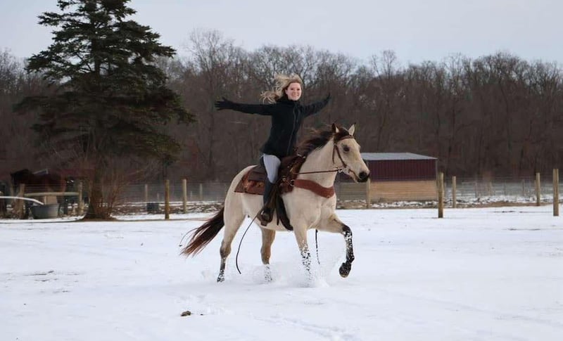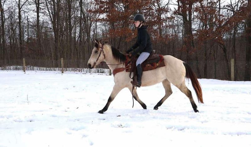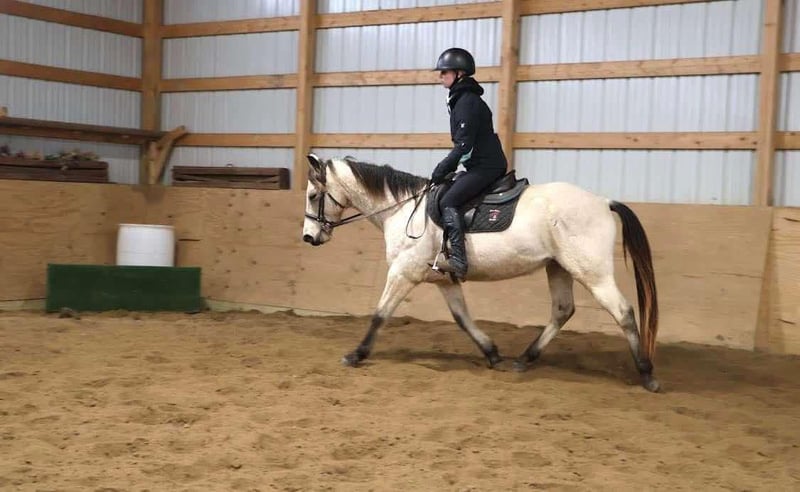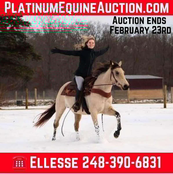 ONLINE AUCTION Place your bids at www.PlatinumEquineAuction.com Starting Bid $3500 Auction ends February 23rd, 2025 Need a new saddle? Check out White Rock Saddles on our website or Facebook! What’s better than butter?? Not much! This 13 year old 14.2hh stout made buttermilk buckskin gelding has it all. He shines like a diamond when the sun hits him! He’s a stunning buttermilk buckskin gelding with a nice mane and tail. Butter is the type of horse that anyone can hop on and enjoy! He rides English, western, and bareback with any bit or with just a halter and lead rope. You can ride him in the arena, out on the trails, or in the wide open field. He walks, trots, and canters with easy. His canter is absolutely delightful to sit on. Butter is eager to please and is a quick learner. He has yet to say no to anything we ask of him. Butter is not the spooky type. He remains cool, calm, and collected in any new situation and place we take him. He has countless of trail miles under his belt. There’s nothing he loves more than to explore the wilderness with his rider. You can take him out alone or in a group. He’s seen it all from logs, mud, tall grass, rocks, puddles, turkeys, deer, and anything else you could think of encountering out in the woods. He walks down the trail path on a loose rein and will go wherever you point him. On the ground he’s easy to catch and lead. His manners are A+ Butter stands well in cross ties or tied to a post while grooming and tacking. For a few years Butter lived in a families backyard. During that time he gave pony rides to kids as young as 3 years old around a trampoline, swing-set, sandbox, and many other toys. Butter is also traffic safe as he has been ridden down a busy road to the apple orchard. Nothing phases this guy! He’s a great all around gelding that will do anything you ask of him! Butter lives in Howell Michigan! Contact Ellesse Schwartz for more information 248-390-6831. ONLINE AUCTION Place your bids at www.PlatinumEquineAuction.com Starting Bid $3500 Auction ends February 23rd, 2025 Need a new saddle? Check out White Rock Saddles on our website or Facebook!